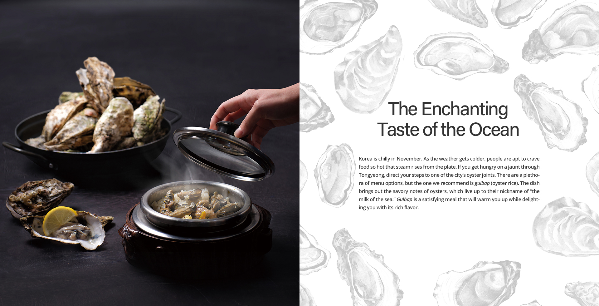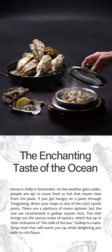 Tongyeong is famous for its oysters. In fact, 80% of Korea’s oysters are produced in this city. The waters around Tongyeong are in an oceanic climate, which means they’re warm in the winter and cool in the summer―an environment where plankton thrives. And where plankton is in abundance, the conditions are ripe for oyster farming. In addition, Tongyeong’s oysters are farmed using the hanging method of aquaculture. In this method, young oysters are attached to scallops or oyster shells and allowed to grow. This aquaculture method was first adopted off the southern coast of Korea in the 1960s and remains in use today. As a result, large amounts of fresh oysters are grown in Tongyeong, and visitors can chow down on high-quality oysters at affordable prices.