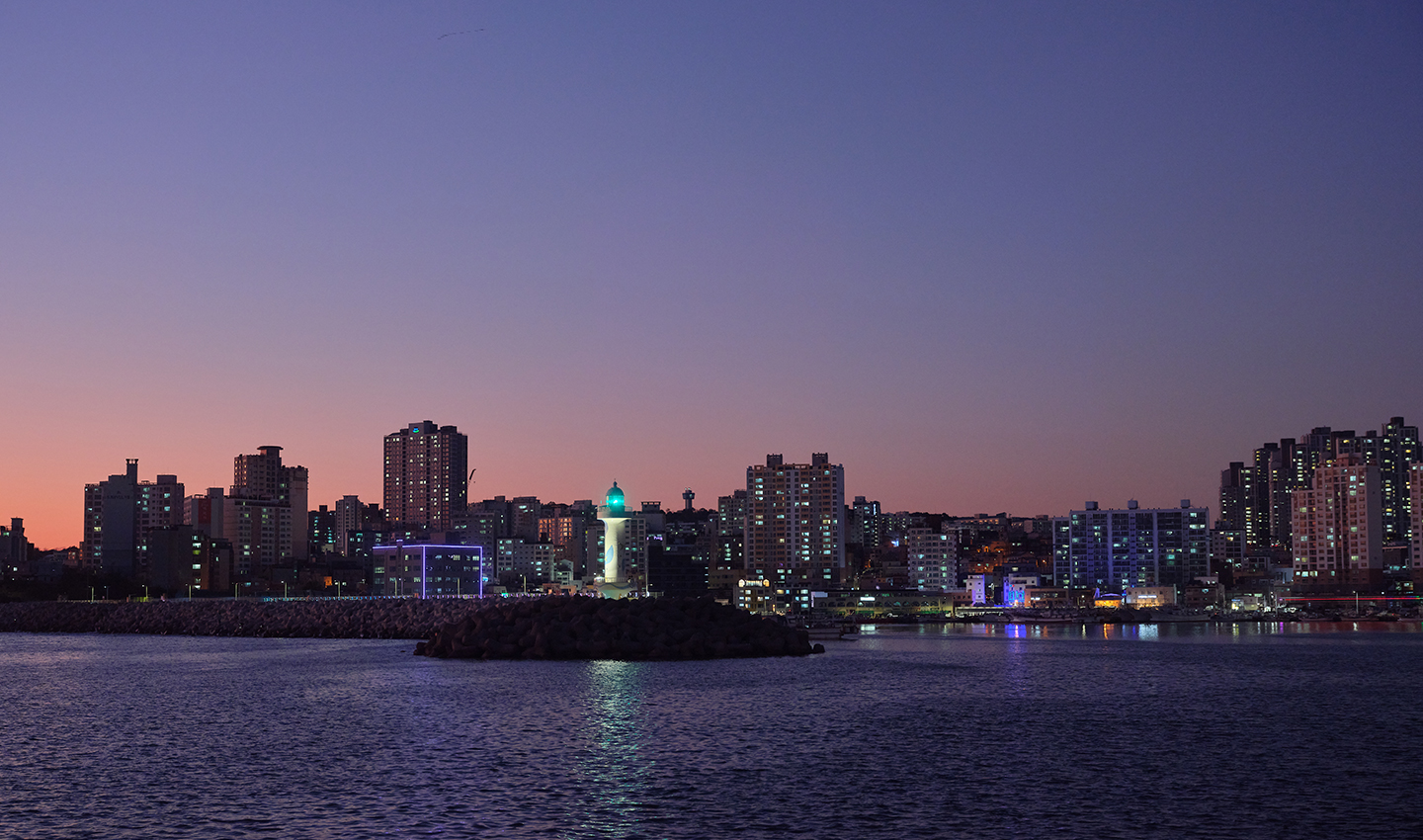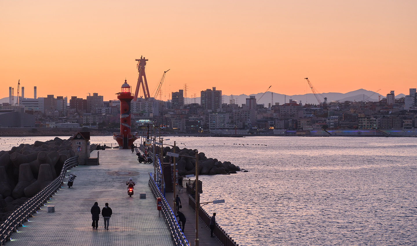 Climb the lighthouse on Seuldo Island around sunset to feast your eyes on an unforgettable scene of beauty. From your perch, you can see the striking rock formations around the lighthouse, the wide lawns and flowering plants and the crashing waves in the sunset’s glow. Far in the distance, Ulsan’s factories and apartments stand tall against a ruddy sky, overlapped by the lighthouse and people walking toward it. It’s the kind of fantastic scene that would be worth stopping time to hold on to a little longer. As the sun goes down, the streetlights, the landscape lights along the walking paths and the beacon in the lighthouse turn on. Manmade lights and natural lights combine to make a scene of true mystery.
