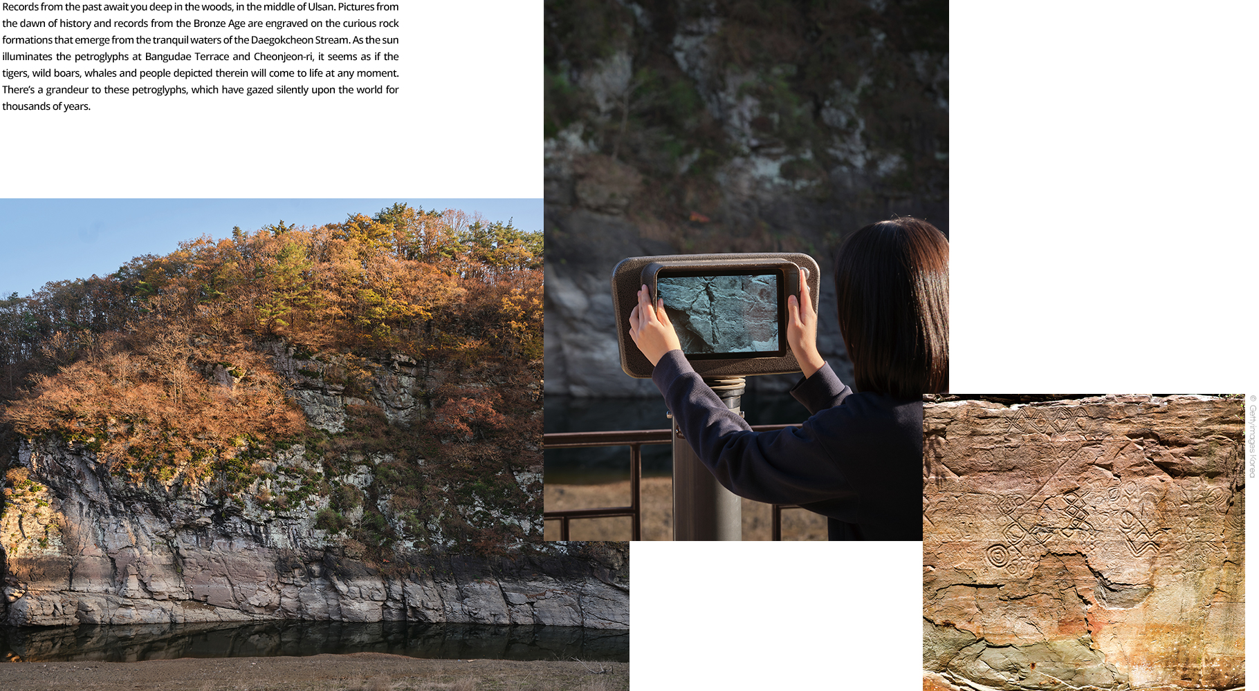 There are places in Ulsan where thousands of years of history come to life. Look no further than the petroglyphs engraved 7,000 years ago on the huge bluffs facing the Daegokcheon Stream, at the headwaters of the Taehwagang River. There are some 300 rock carvings here depicting humans, whales and other sea creatures and tools used in hunting and fishing.