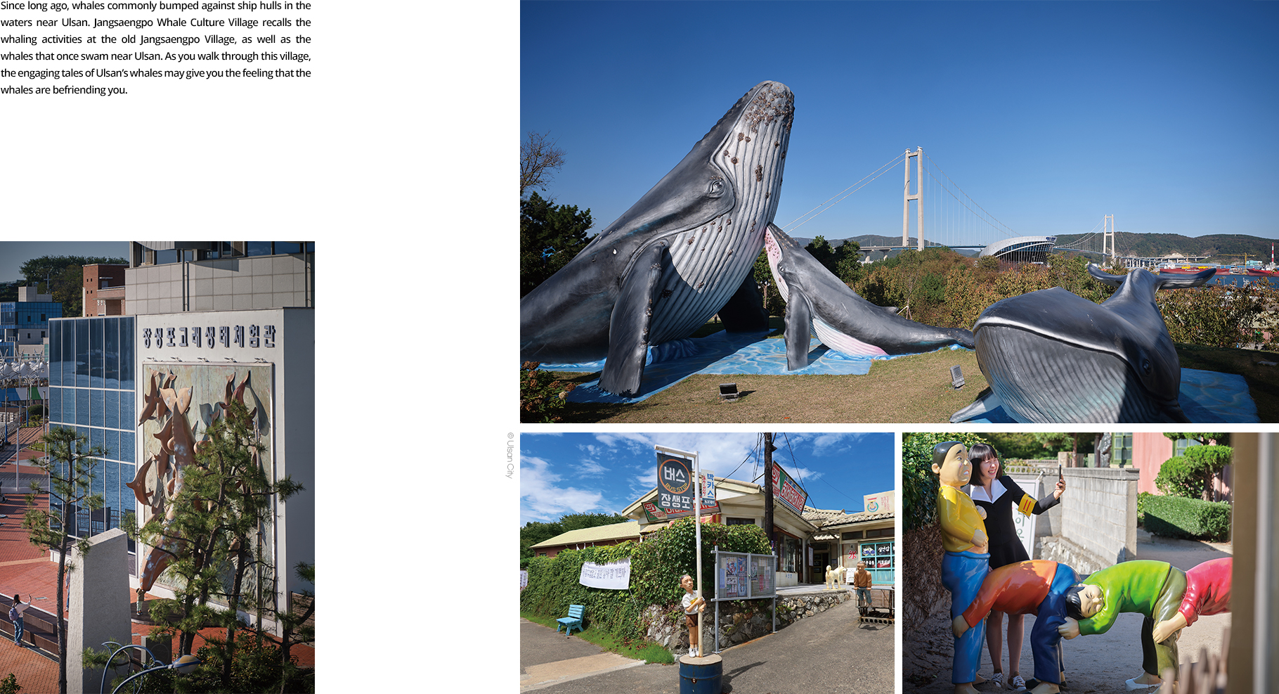As can be inferred from the petroglyphs at Bangudae Terrace, the people of Ulsan have been hunting whales since long ago. The place where whaling was pursued most vigorously in modern times was the village of Jangsaengpo. Jangsaengpo was a harbor that formed on the steep slopes on the inner side of Ulsan Bay. The deep waters here were well-suited for larger ships to load and unload whales and facilities to dismember whales and process their meat were soon established at Jangsaengpo. The local economy took a temporary hit when the International Whaling Commission announced a moratorium on commercial whale hunting in 1985. But even today, visitors here can see the close connections between Ulsan and whales. The area has been designated the Jangsaengpo Whale Culture Zone to preserve the stories of this place.
