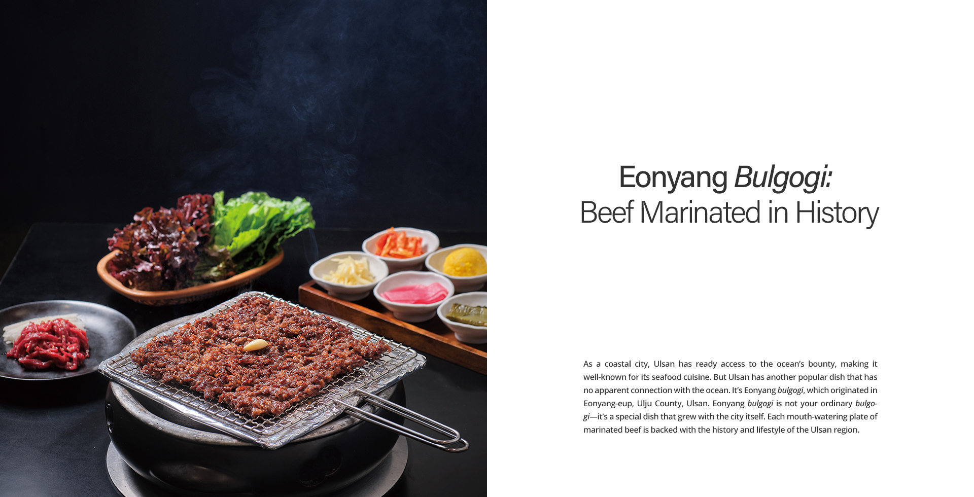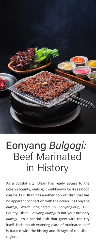 Since long ago, Ulsan has produced iron and salt. Tempering iron and boiling salt water to make salt required a lot of charcoal, which was brought in from the town of Eonyang, just to the west of Ulsan. The town made good-quality charcoal from the trees lining the slopes of the surrounding Sinbulsan Mountain, Gajisan Mountain and Ganwolsan Mountain. Furthermore, Eonyang was situated near wide meadows and beside the pristine waters of the upper Taehwagang River. This was cow country, and cattle were raised at each farm in the area. A cattle market and slaughterhouse were also based here, making it easy to come by freshly butchered beef.