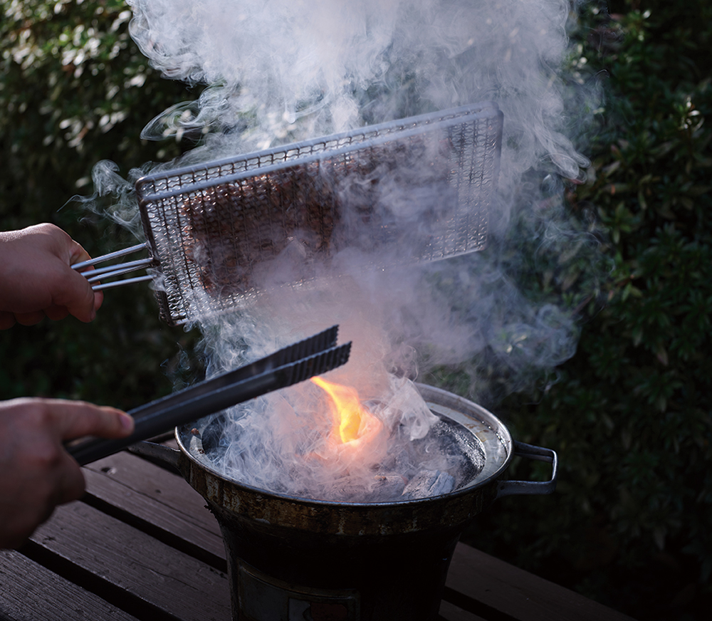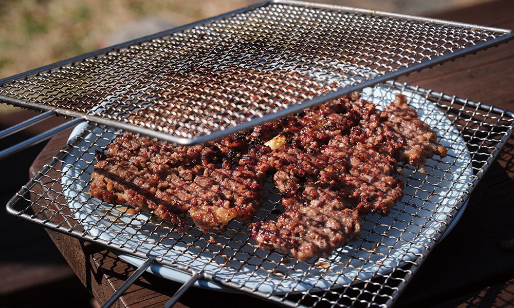 Once the beef has been seasoned with this delicious marinade, it’s time to add that smoky flavor. The marinated beef is molded into a big patty that is then placed between two gridirons and slowly cooked over charcoal. The smoky aroma of the charcoal and the sweet fragrance of the marinade simmering over the flame wafts through the area, whetting appetites. When both sides of the patty are browning, it’s sometimes garnished with slices of king oyster mushrooms or garlic cloves.