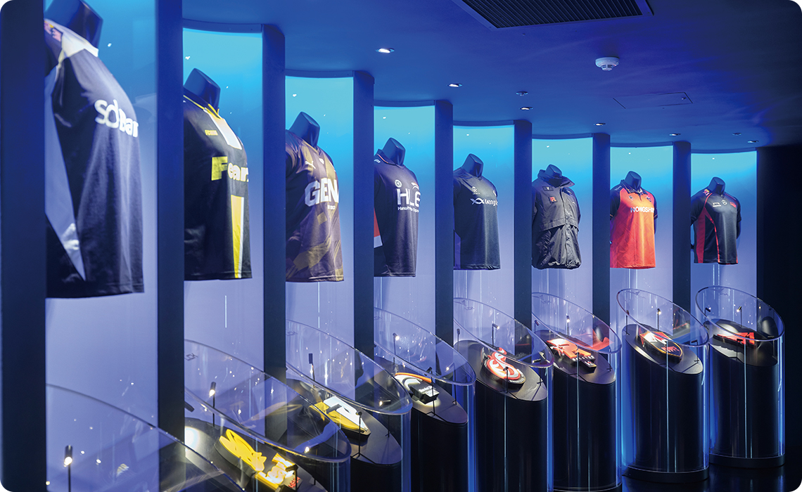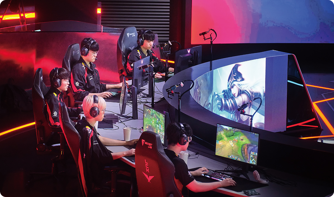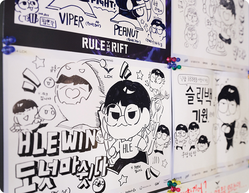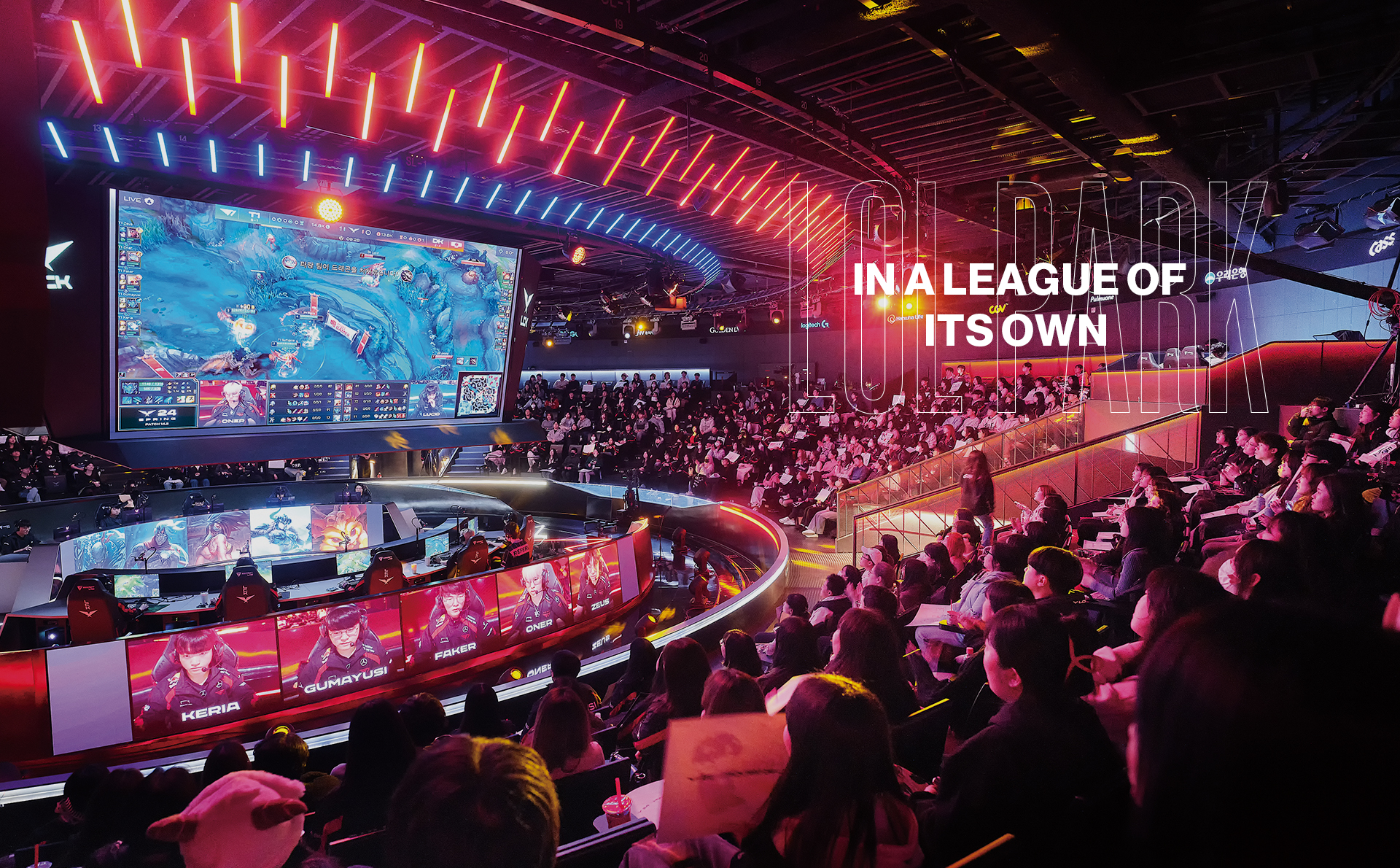 Once inside LoL Park, the first thing you’ll see is the Riot PC Bang. Riot Games is the developer of LoL; a PC bang is a LAN gaming center, a distinctive part of Korean gaming culture. The dim space is faintly illuminated by a mysterious neon glow. There are a total of 101 seats available here, and all the equipment is optimized for gaming. The computers are all high-performance machines made by companies famous for their gaming computers, ensuring that games load quickly and graphics are smooth, much to gamers’ satisfaction. The keyboards, mouses, chairs and tables are all suitable for gaming, too. A modest selection of beverages and snacks are sold here, keeping hunger at bay so you can focus on the game.