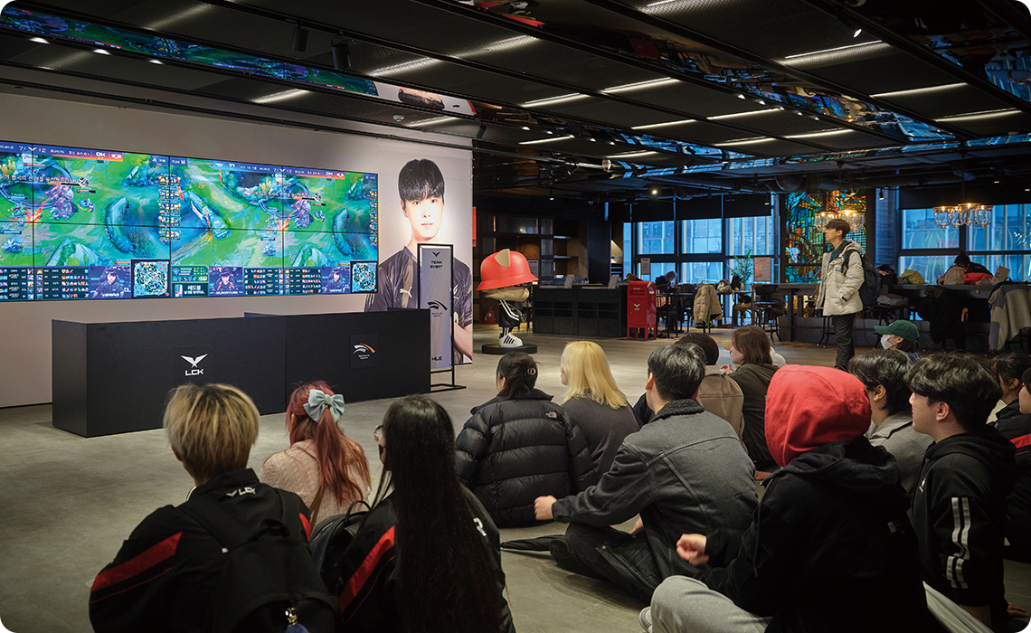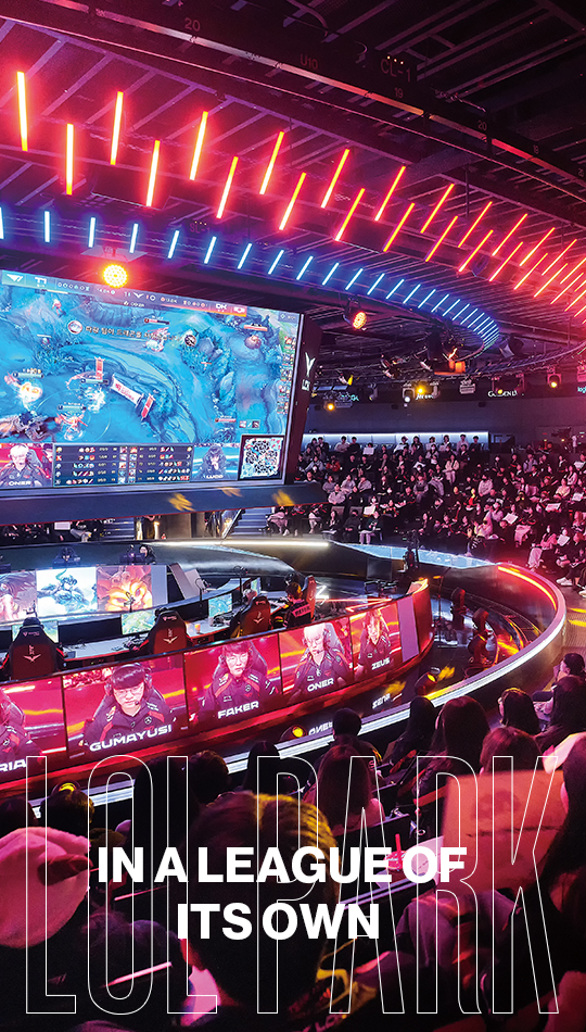LoL Park is located near Jonggak Station, in the heart of Seoul, the Korean capital and the city most-visited by foreign tourists. As you enter a nondescript building near the station and take the escalator to the top, prepare to be greeted by adorably pixelated LoL champions on the long LED panels on the narrow ceiling. After a moment spent appreciating the artwork, the escalator will whisk you up to the entrance of LoL Park.
