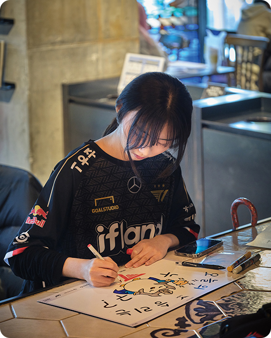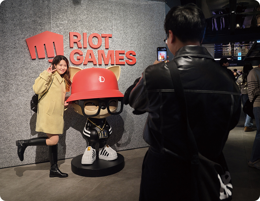 In front of the Riot PC Bang is the Riot Store, which sells LoL items. The products here run the gamut from elaborate figurines to cutesy dolls and cushions. There are also lines of stationery and novels set in the LoL universe, and on another side of the store, hats featuring popular LoL champions and items of clothing suitable for everyday wear. All the outfits can be tried on by interested shoppers. But if you’re more interested in items featuring the League of Legends Champions Korea (LCK), the league where Korea’s best LoL teams compete, you’ll want to head toward the arena. The separate LCK shop there displays keychains from popular players, as well as team uniforms.