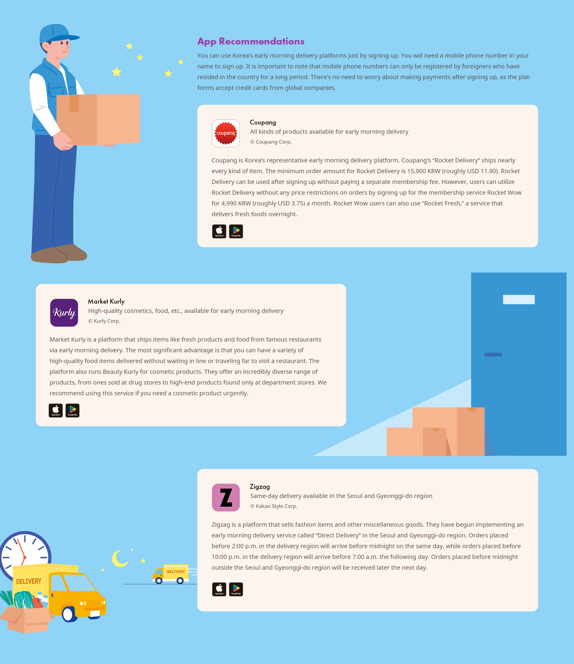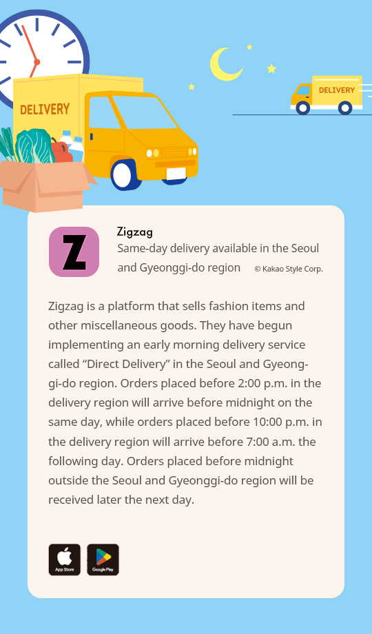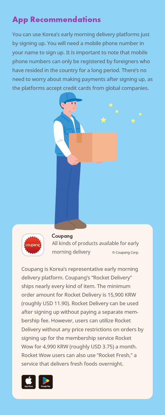 Have you ever suddenly realized that you needed to buy something? You might feel anxious because you need to purchase something quickly, like a gift or school supplies, but it’s the middle of the night and all stores are closed. You can resolve such situations with one click in Korea. It’s all thanks to the early morning delivery system, which allows customers to receive numerous items early the following day as long as orders are placed within a certain time set by the company. Numerous platforms have implemented early morning delivery, such as ones that sell groceries, cosmetics and clothes, so search if you need to buy something quickly.
