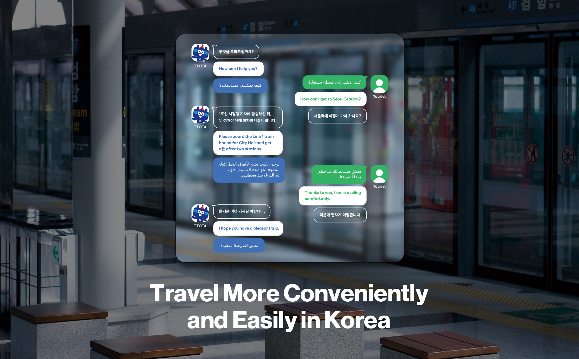 The system not only offers the simultaneous communication service but also features additional services, such as route searches based on subway maps, transfer and travel time data, fare information and availability of the storage service T-Luggage.