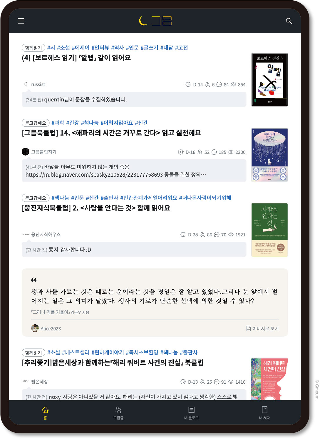 Gmeum is currently the most active online book club community in Korea. Diverse individuals engage in book-related projects and freely converse.