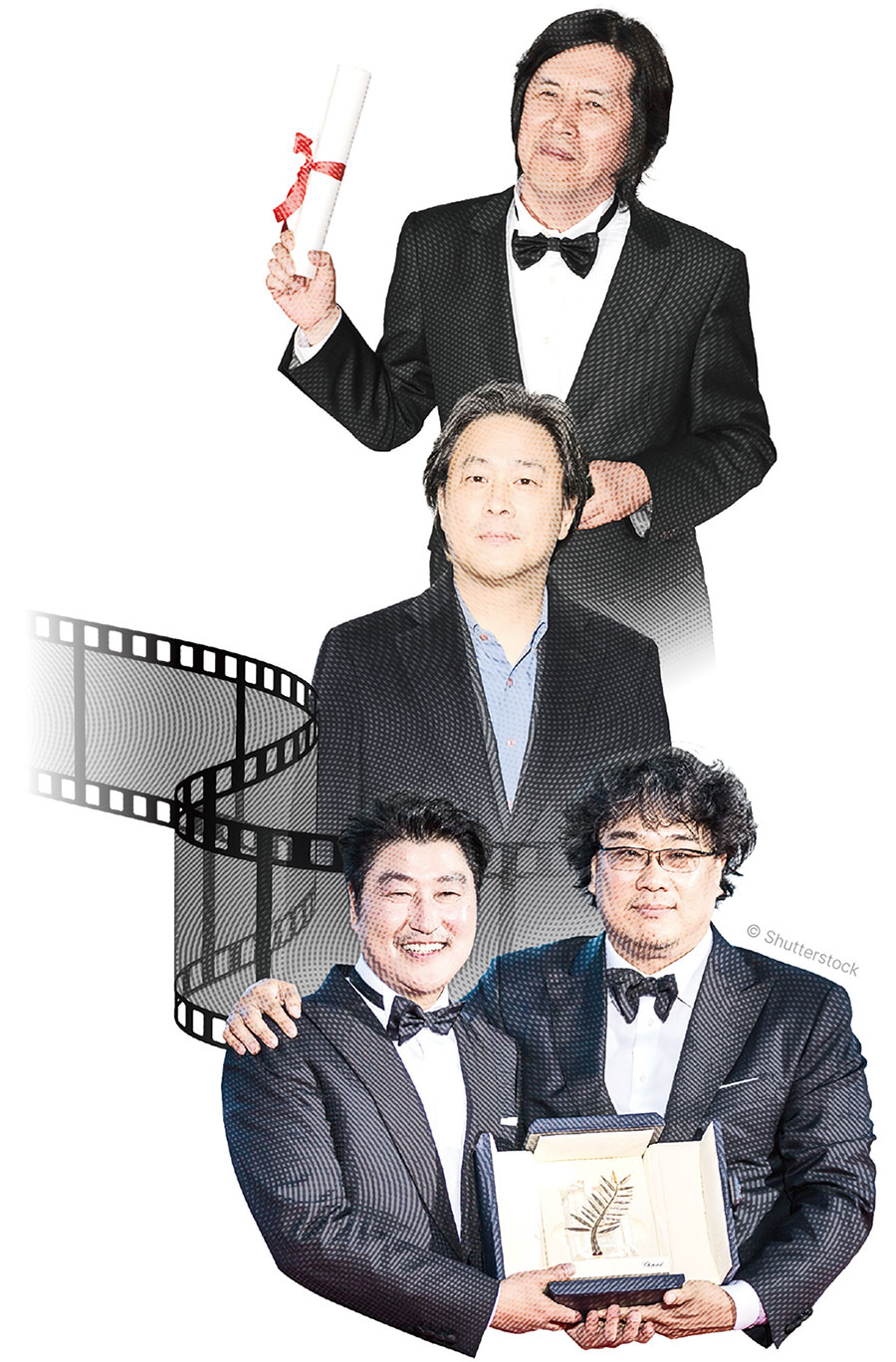 These are iconic film directors from Korea. From the top in order, Lee Chang-dong, Park Chan-wook, on the bottom right Bong Joon-ho and to his left, the actor Song Kang-ho.