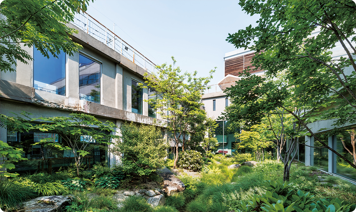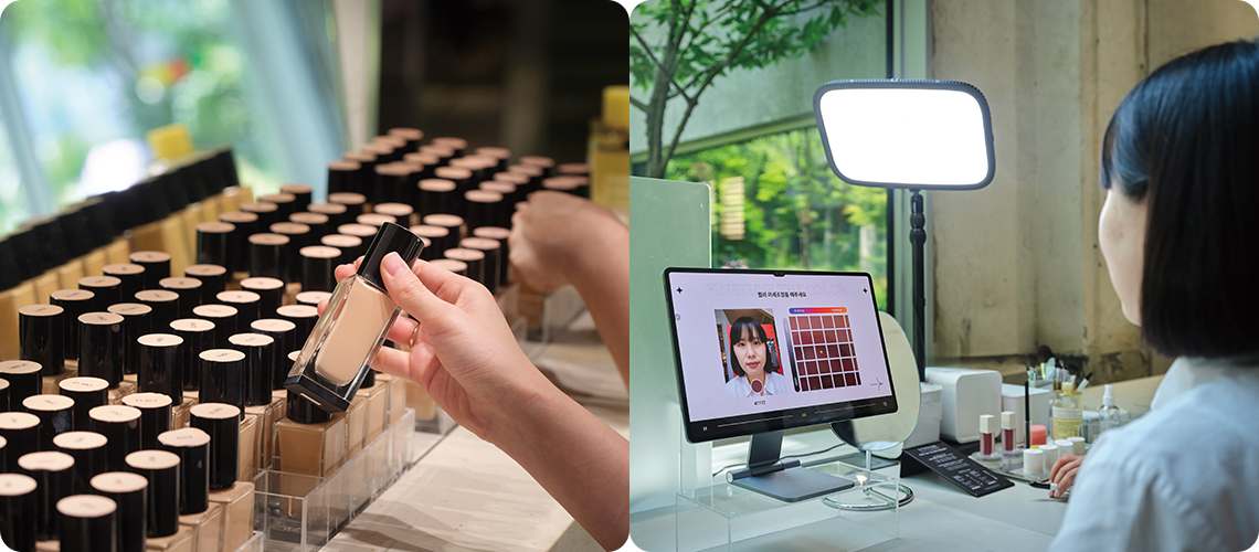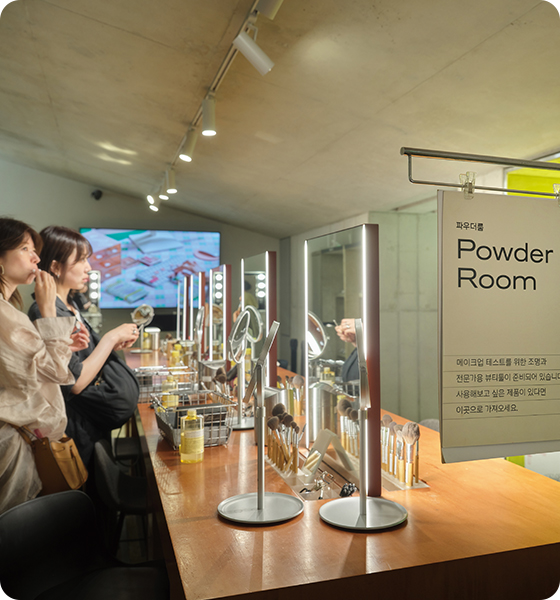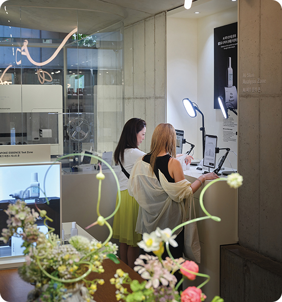 Once you leave the cleansing room and continue down the hallway, a remarkable sight awaits you: the beauty library, which brings together Amorepacific’s thirty or so brands. Over a thousand beauty products are neatly displayed on concrete shelves, which highlight the products while putting the brands on the back burner. It’s thrilling to see such a comprehensive assembly of products that would otherwise only be accessible online or through individual visits to each brand’s store. This is your chance to try out these products to your heart’s content, and all without leaving the room.