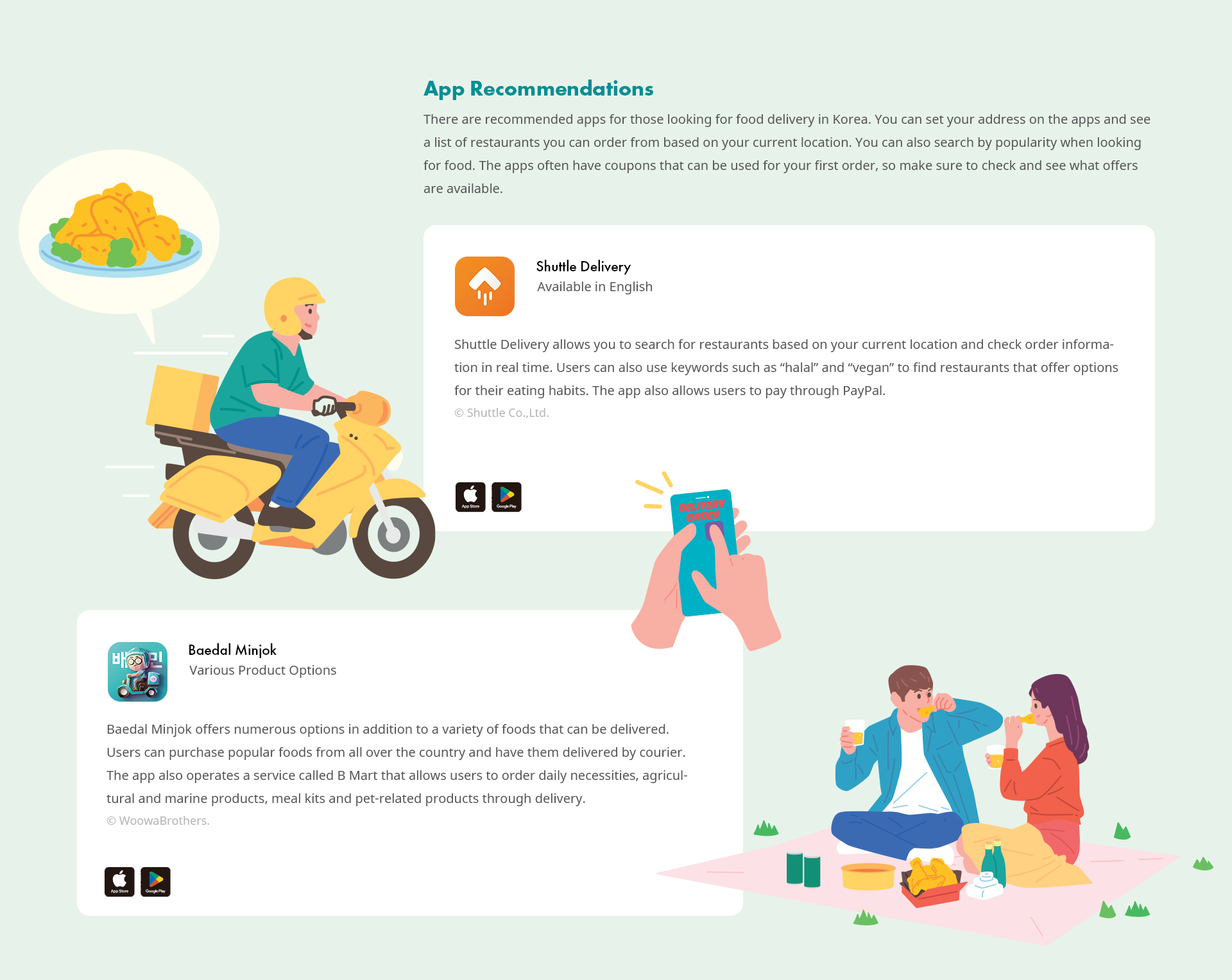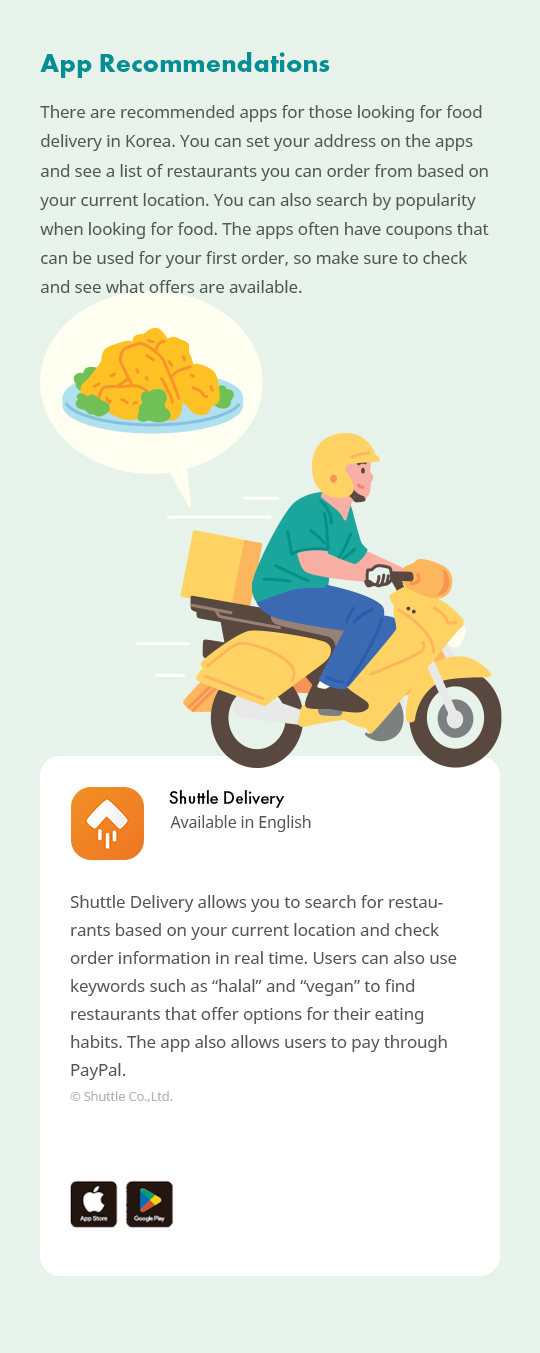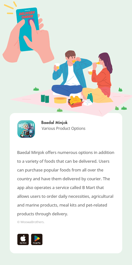 Food delivery became more diverse after the pandemic passed. There was a time when only chicken and jjajangmyeon (noodles in black bean sauce) could be delivered. However, delivery options have expanded, and people can even order desserts such as ice cream and cotton candy. You can even order pre-packaged meal kits for soups and stews. The food in these kits comes prepped and packed, so all you have to do is heat them up at home and enjoy. Delivery apps have allowed the food delivery culture in Korea to blossom by offering various types of food and preparations.