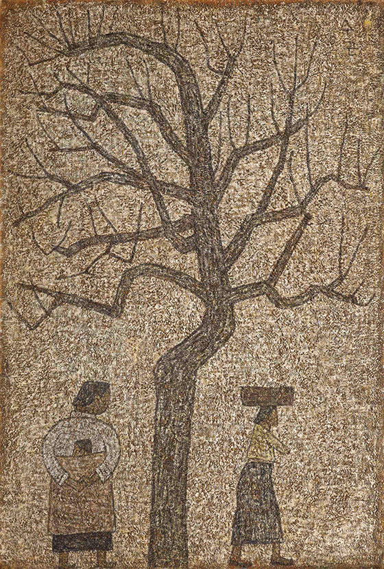 The allure of Korean art lies in its modernity and innovative challenges, built upon a foundation of history and tradition. Lee Ungno (1904-1989) progressed from ink paintings of bamboo to Japanese art techniques before moving to France in 1959 to explore experimental art. He ultimately developed his unique abstract style. Park Soo-keun (1914-1965), a beloved national painter, drew inspiration from Gyeongju’s rock-carved Buddha statues. He created a distinctive style by repeatedly layering unmixed oil paint, producing images resembling stone carvings. Lee Jung-seob (1916-1956), a tragic genius, infused his cow paintings with the national spirit. Influenced by Goguryeo tomb murals he saw as a child in Pyongyang, he combined Goryeo celadon inlaying and metal craft techniques to create “silver foil paintings”—the first Korean works acquired by New York’s the Museum of Modern Art (MoMA). Kim Whanki (1913-1974), a pioneer of Korean abstract art, admired moon jars for embodying Korean aesthetics. His works, featuring white porcelain motifs, culminated in all-over dot paintings inspired by ink’s spreading effect.