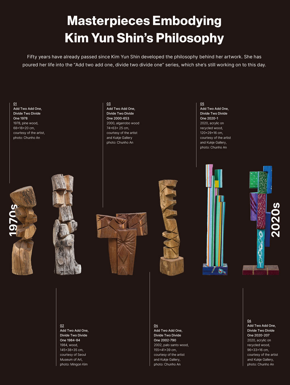 Kim chose to live in Argentina, where she dedicated several decades of her life solely to her work as an artist. Utilizing various trees such as algarrobo, lapacho, caldén and olive, her pieces seek to achieve visual harmony between the bark and wood. While living in Mexico, she carried out experimental work cutting into stones such as onyx to reveal the subtle colors inside. For three decades following her departure from Korea, she honed a form of expression unique to herself, eventually opening the Museo Kim Yun Shin, an art museum named after herself, in 2008.
