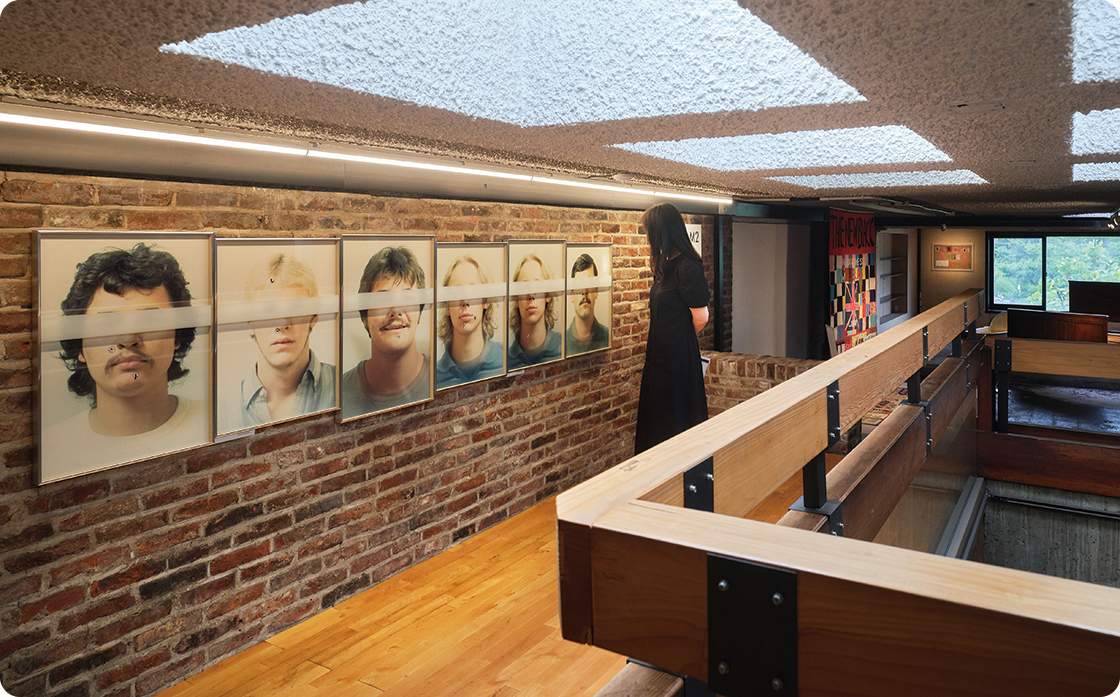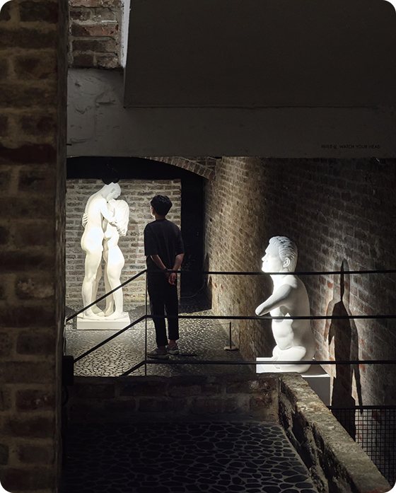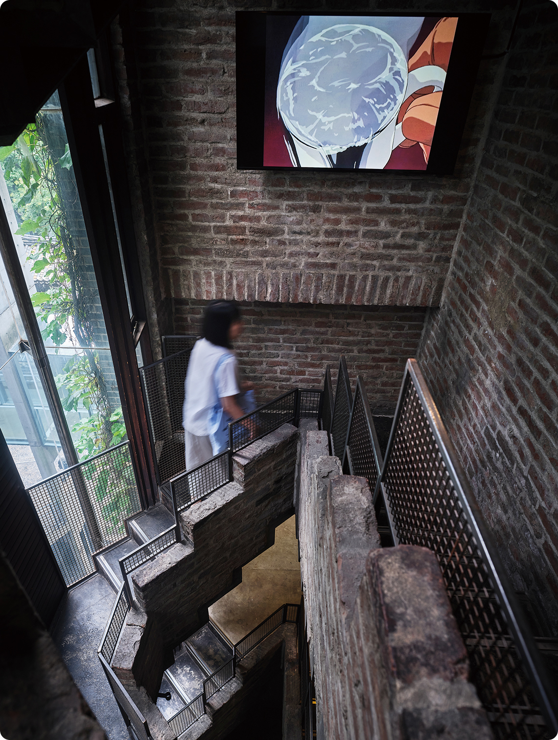 Passing along narrow corridors between red brick walls, you come to two striking staircases: one triangular, and the other circular, like the interior of a turret. Both staircases lead to spaces wildly different from a standard exhibition room. They are the unique sort of rooms you might expect to encounter in a miniature palace or a castle from a fairy tale. Peek inside to see how the works of a particular artist illuminate each of these rooms.