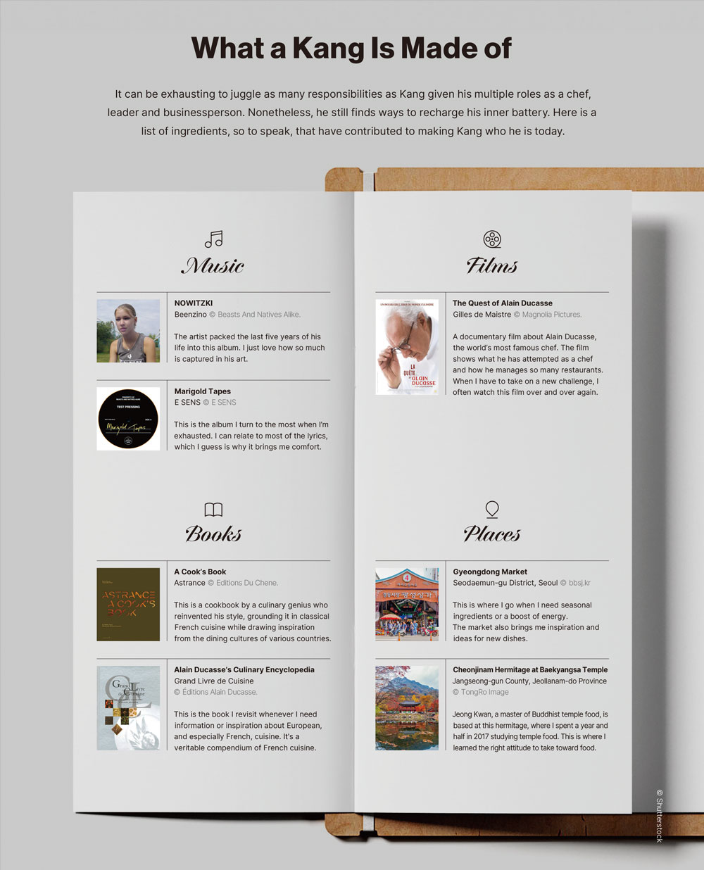 Kang wanted to prove that judgment wrong, and to establish a clear and unique vision for his restaurant. This was the only way he could achieve his goals of promoting Mingles and Korean cuisine. So he turned at once to Jeong Kwan, a Buddhist nun who’s regarded as a master of both authentic Korean cuisine and Buddhist temple food. He spent the next year and a half delving into Korean cuisine. He has also continued researching the world’s dining cultures and ingredients.