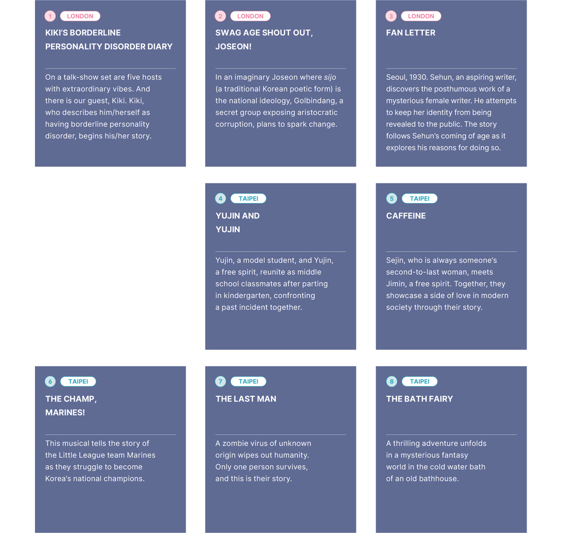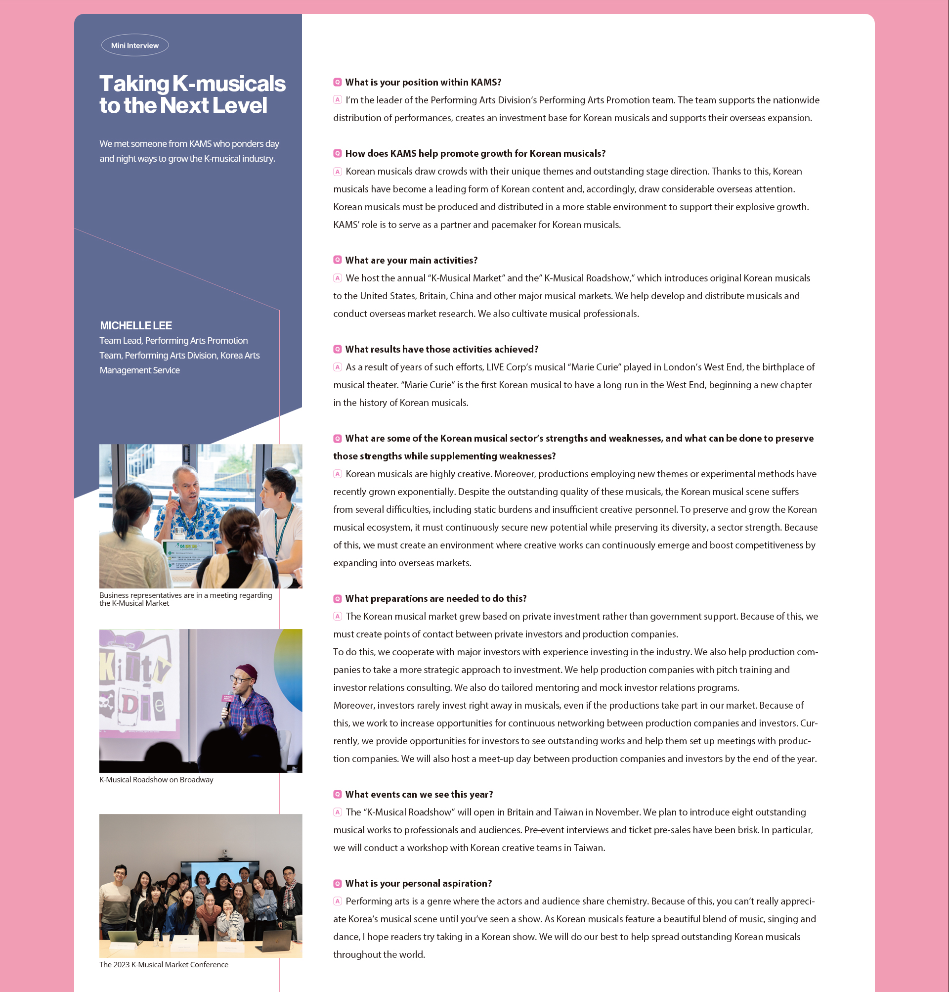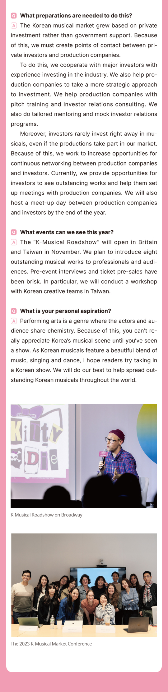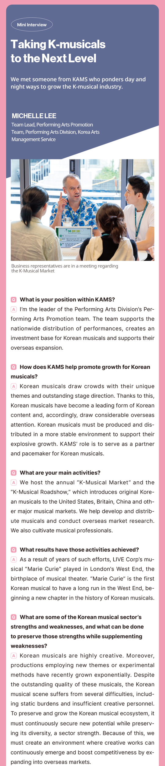 KAMS’ “K-Musical Market” has promoted exchanges between local and international musical producers, investors and overseas specialists since its first iteration in 2021. The “K-Musical Roadshow” showcases outstanding productions of original Korean musicals to industry professionals in international markets. Through this initiative, KAMS has presented original showcases of Korean productions in Shanghai, China (2016), Tokyo, Japan (2023) and Taipei, Taiwan (2024). Additionally, localized versions of Korean creative musicals have been introduced to audiences in Britain (2022, 2024) and the United States (2023), further expanding their reach across global markets.