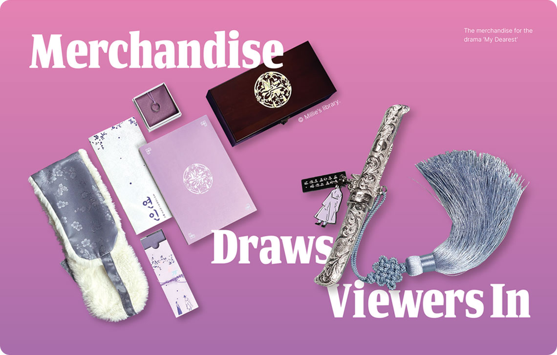 Merchandise from the drama “My Dearest” offers a classic example of how tie-in products can promote viewers’ absorption in a TV series. In this love story set in the Joseon Dynasty, the key objects that confirm the lovebirds’ relationship were made as merchandise. The ring in the show that represents the couple’s love inspired a wearable ring, and the silver knife that signifies the two characters’ destiny was the basis for a decorative knife that serves as a letter opener.