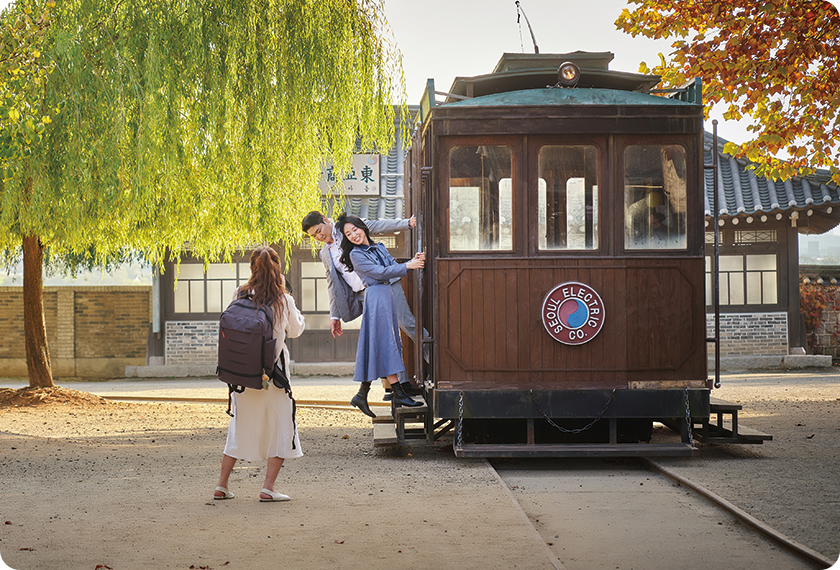 Moving down the road, visitors encounter a condensed version of Jongno street. Two landmarks immediately catch the eye: Bosingak and Hanseong Electric Co. Bosingak, a historic bell tower, once announced time and national events during the Joseon Dynasty, while Hanseong Electric Company, established in 1891, was the city’s provider of electricity. The imposing Hanseong Electric Company building houses a special exhibition featuring “Mr. Sunshine” photographs, an exhibit about Hwang Ki-hwan (the inspiration for protagonist Eugene Choi), and flags from the Korean Empire period.