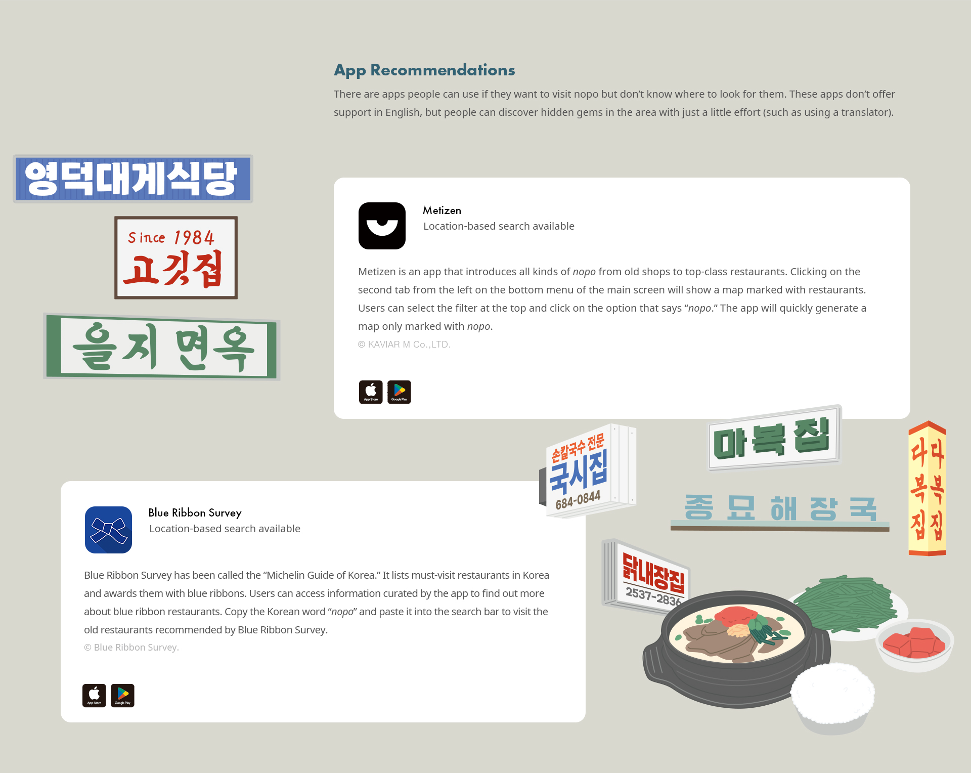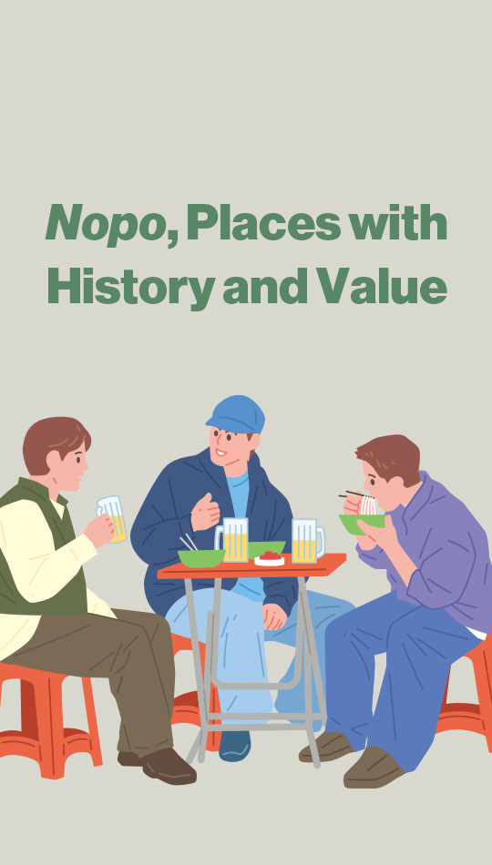 Individuals, groups and even the government pay attention to nopo. This is because nopo are delicious, appealing, interesting and meaningful. Moreover, everyone has their own reasons for visiting nopo. This trend of seeking out things from the past rather than chasing the latest trends is valuable in and of itself. Nopo are a great way to bridge the gap between the older and younger generations by preserving history while enjoying the present.