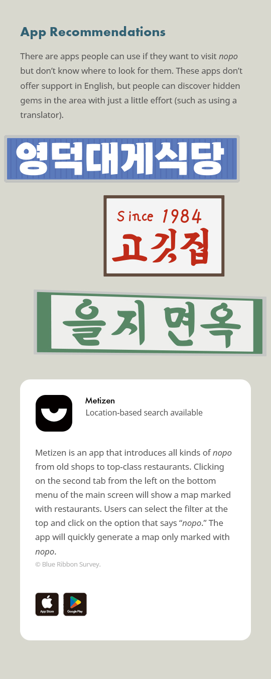 That’s not all. Celebrities and influencers alike create content on video platforms like YouTube by visiting nopo in different regions. They go to areas outside of Seoul to introduce hidden restaurants that other influencers talk about or ask residents on the street to introduce nopo that represent the area.