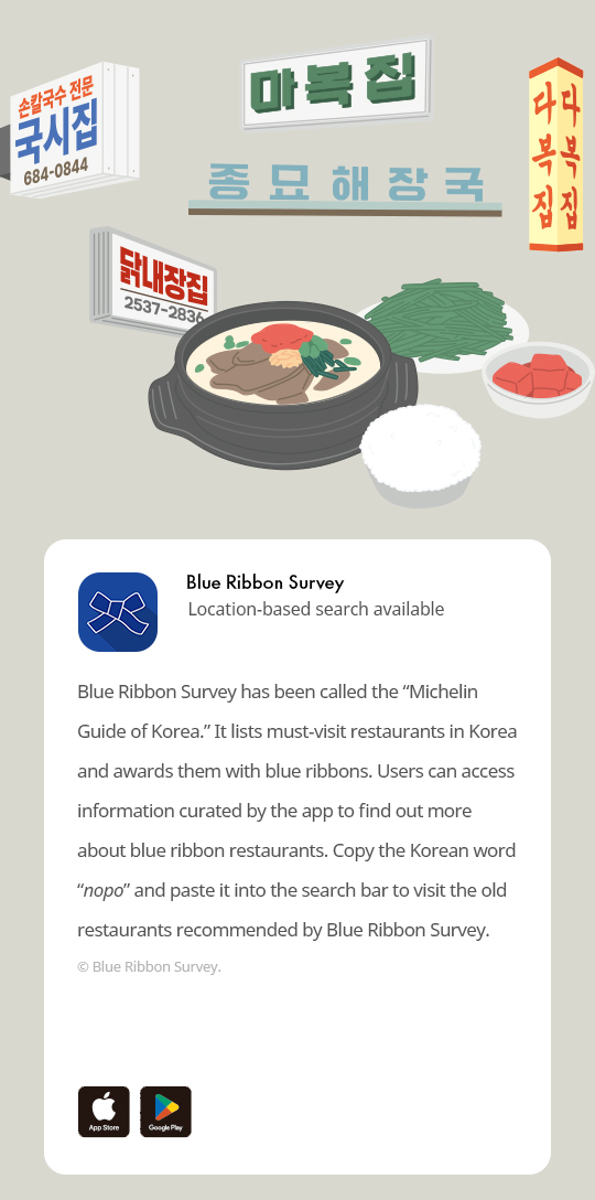 National organizations and local governments have stepped up to designate and highlight old restaurants with storied histories. These old restaurants are the living, breathing history of the region. The Ministry of SMEs and Startups has designated restaurants nationwide that have been in operation for more than 30 years as century-old stores. In addition, the Seoul Metropolitan Government has introduced Seoul Future Heritage as proposed by citizens, with a separate category for restaurants. The category features over 50 old restaurants that opened between 1920 and 1970.