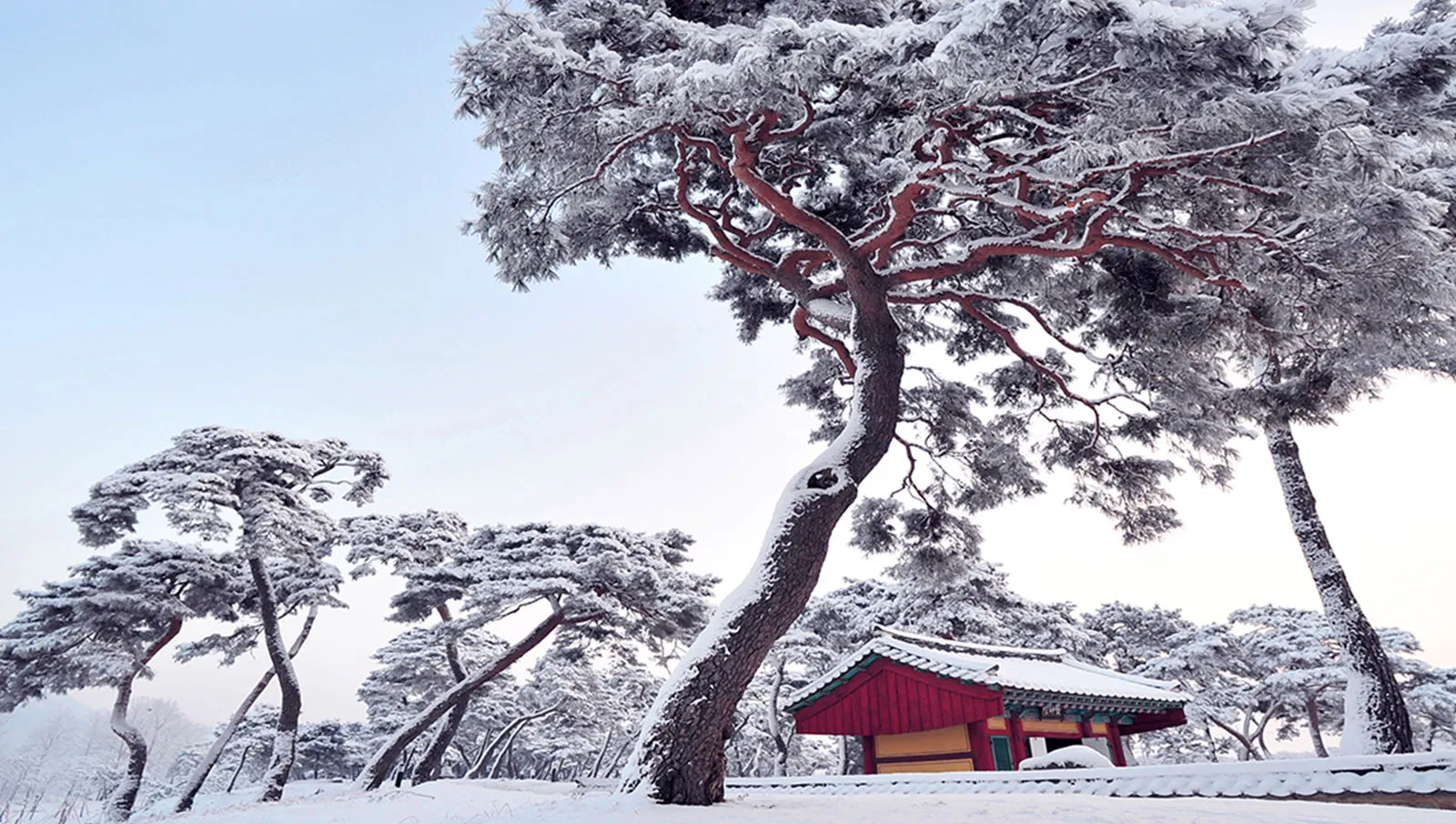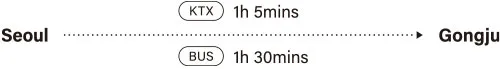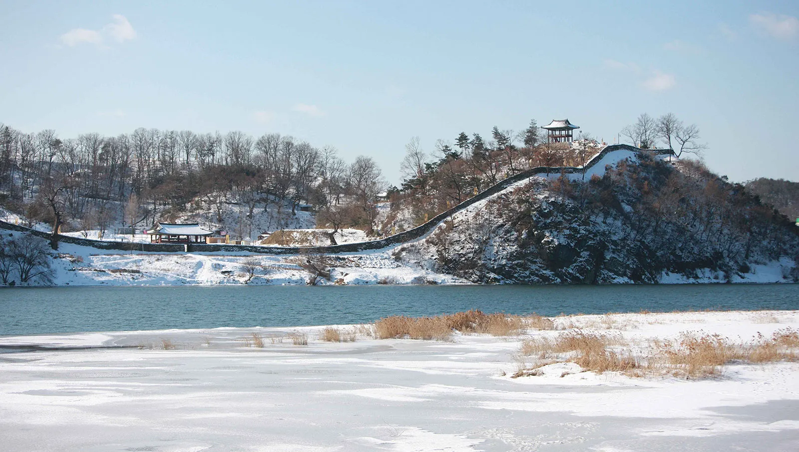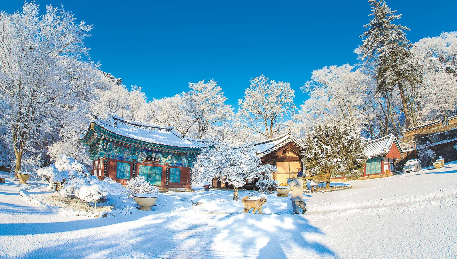 Leaving Seoul behind, the journey to Gongju begins. Throughout the hour-and-a-half drive, the cloudless winter sky stretches clear and bright, while gray-brown trees stripped to their branches and brilliant white snow create a dazzling landscape.