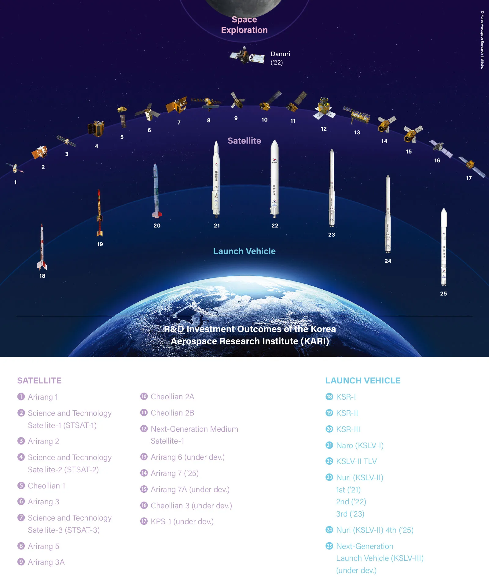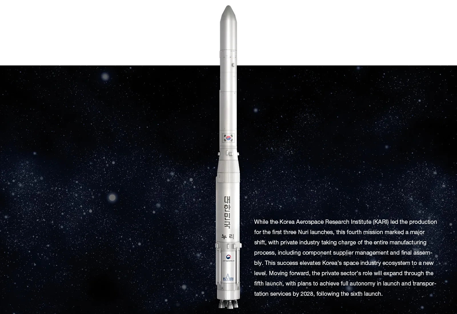 The Nuri rocket, which followed the Naro rocket, is a three-stage vehicle using liquid propellant. After failing to reach orbit on its first attempt in 2021, it demonstrated reliable performance with consecutive successes in 2022 and 2023. The November 2025 fourth launch was particularly significant: it marked the first success after KARI transferred system integration technology to private industry, signaling Nuri’s transition to commercial operations. The fifth launch, scheduled for June 2026, will carry five micro-constellation satellites plus 10 CubeSats developed by universities and companies. The sixth launch in 2027 will deploy 12 domestically-built satellites, including Korea’s first “active debris removal satellite” with space debris removal capabilities for environmental protection demonstrations.