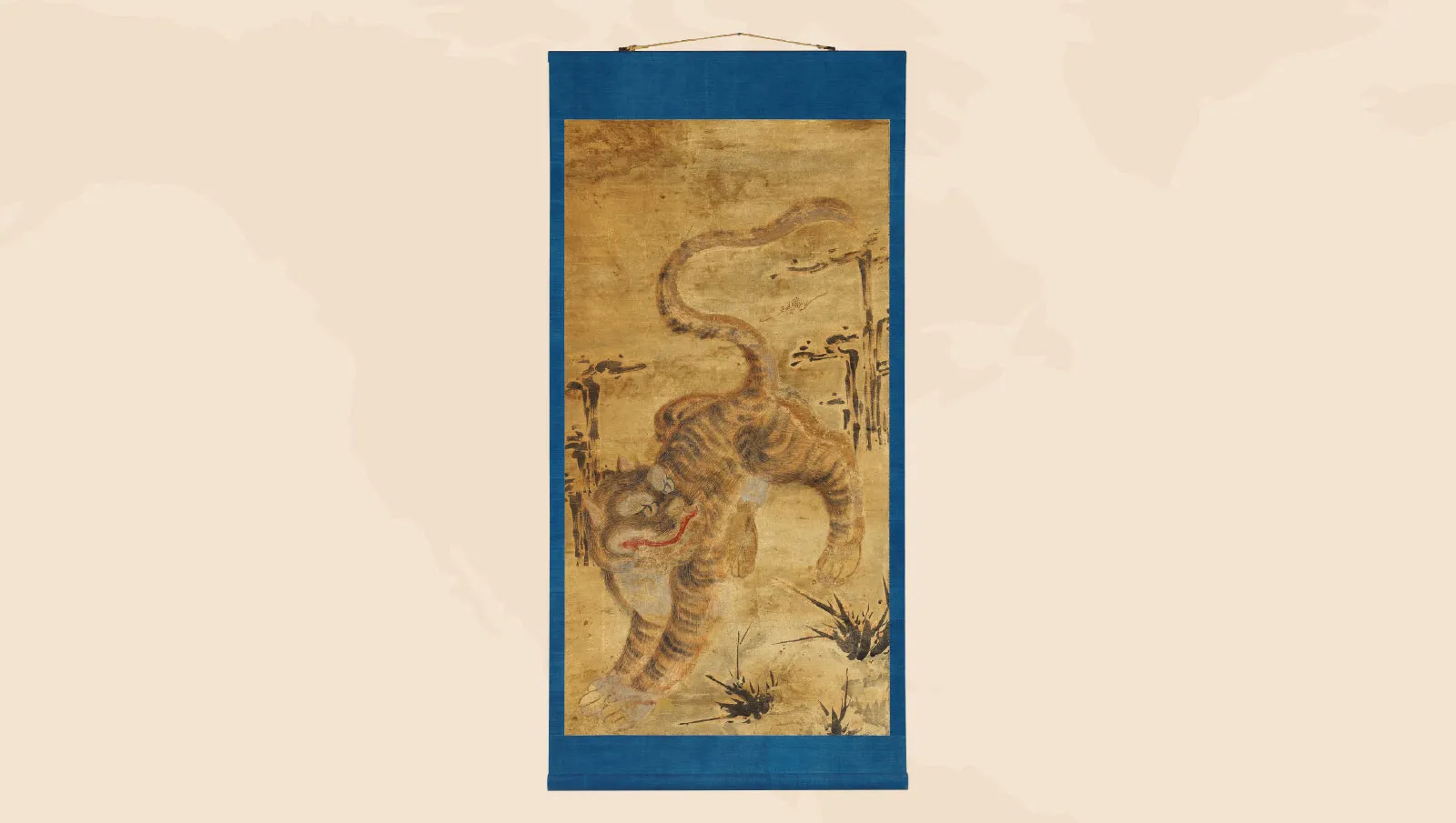 The museum’s companion pieces—”Tiger,” “Dragon God” and “Byeolsang God”—are minhwa created in the same context. “Tiger” captures a tiger, a symbol of power that wards off misfortune, gazing at a bat. “Dragon God” depicts a man with a dragon—a symbol of protection and abundance—in the background, illustrating the dragon’s favor upon him. “Byeolsang God” portrays a deity who protects the nation and household from harm, appropriately rendered in military dress to reflect this role.
