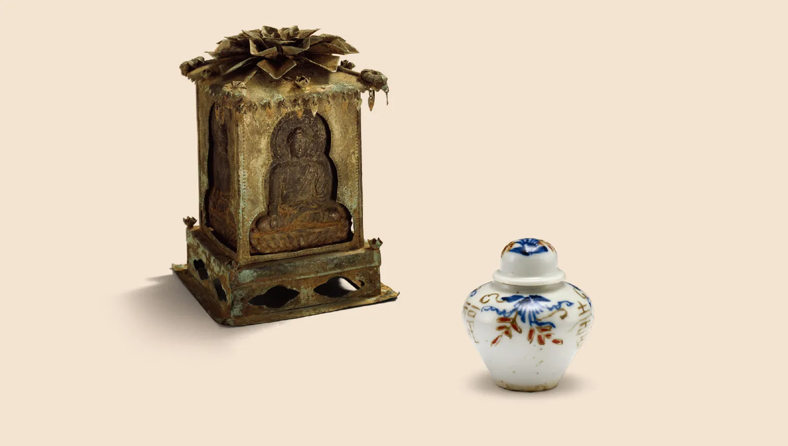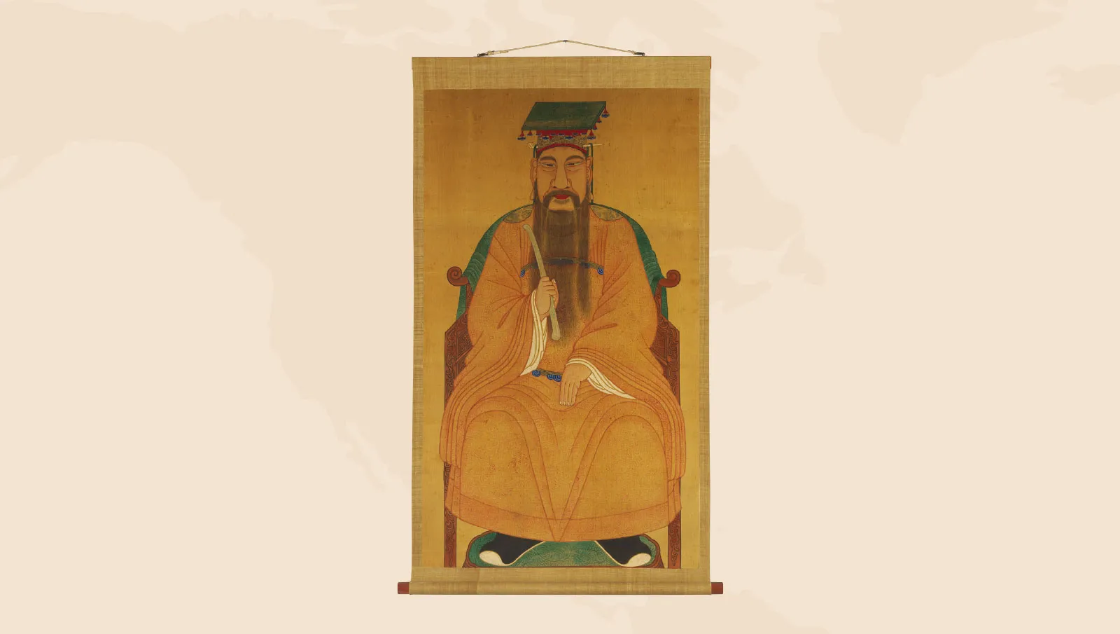Consider the museum’s late 19th-century minhwa (folk painting) of the Joseon Dynasty (1392-1910), the “Great Jade Emperor.” A figure sits on a chair wearing reddish-yellow robes adorned with gold decoration. Gold embellishment also adorns the hat, waist belt and sash, while thick eyebrows, a long flowing beard, and even the skin texture around the eyes are rendered with delicate precision. The solemn, humorless expression and the hierarchy evident in the costume reveal this figure’s high authority.