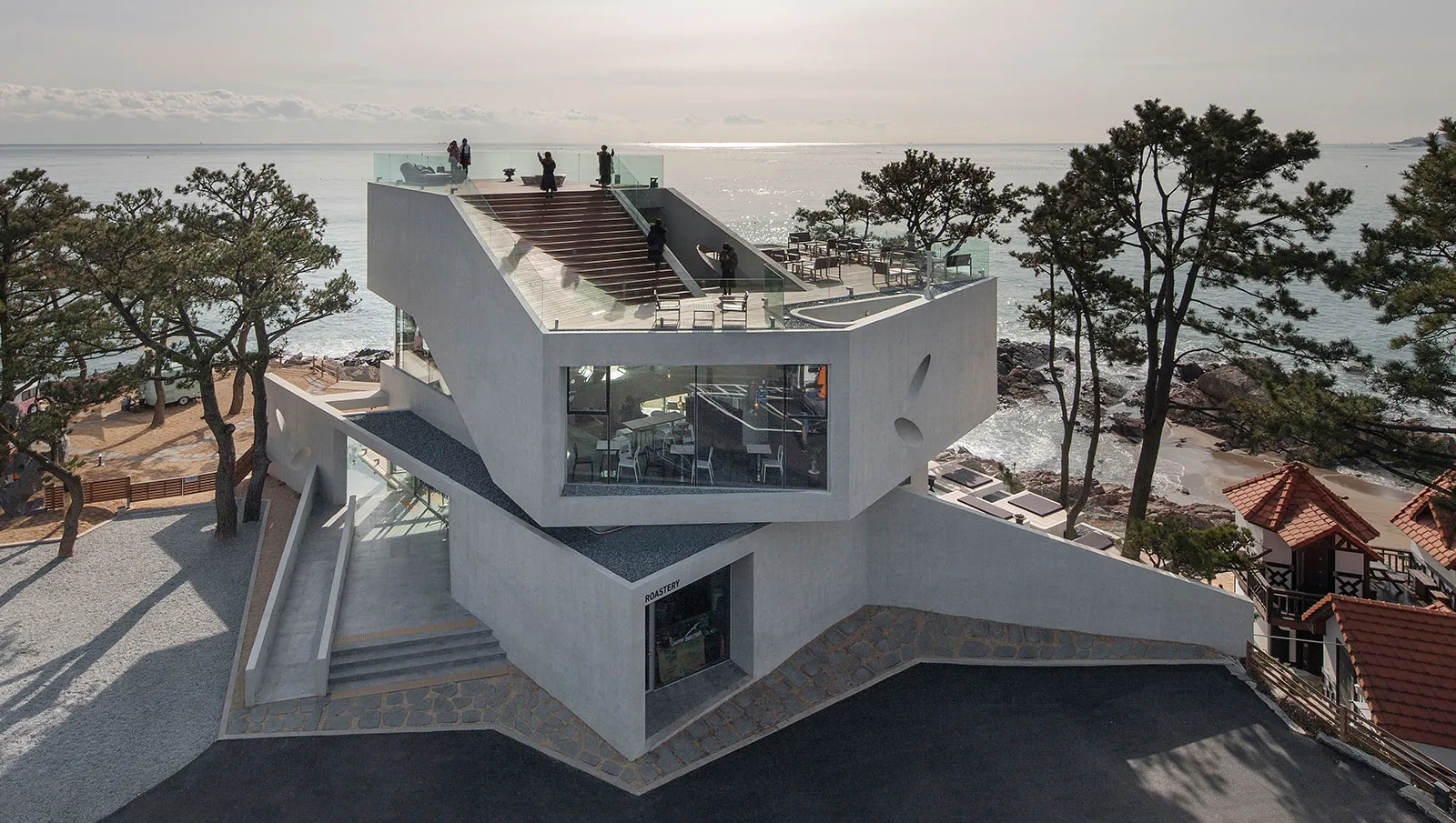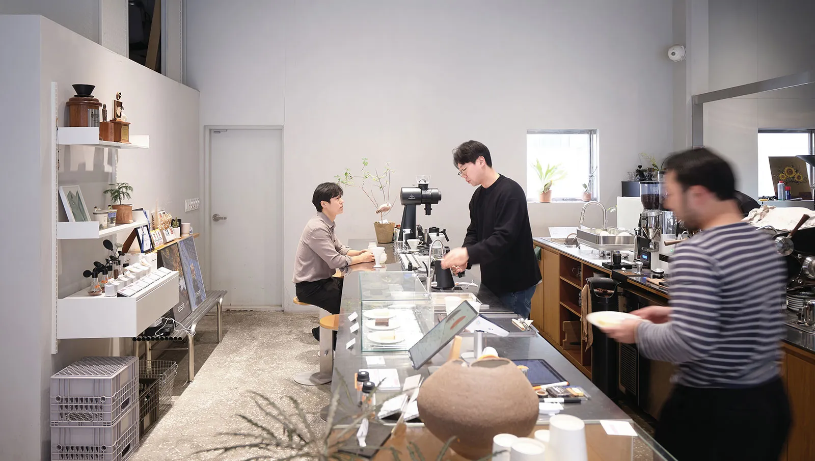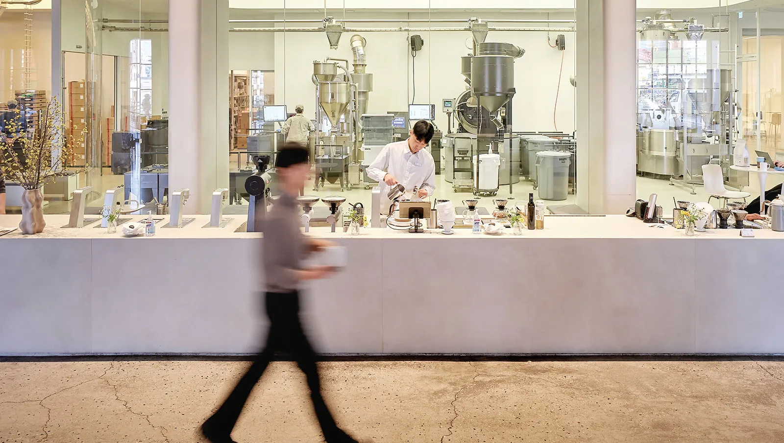 The space features high ceilings, wide open areas and large windows that open generously toward the sea. Inside the bar area, roasting machines are running, while baristas on one side focus intently on extraction. Customers can sit along the extended bar seating and watch the entire process: how their coffee is ground, how it meets water and how the aroma rises.