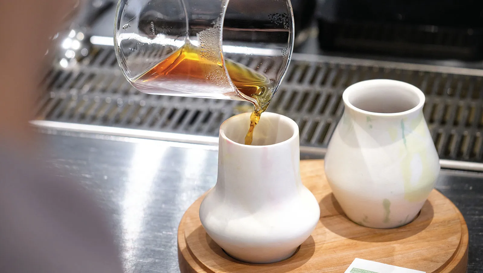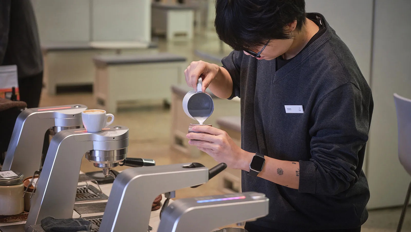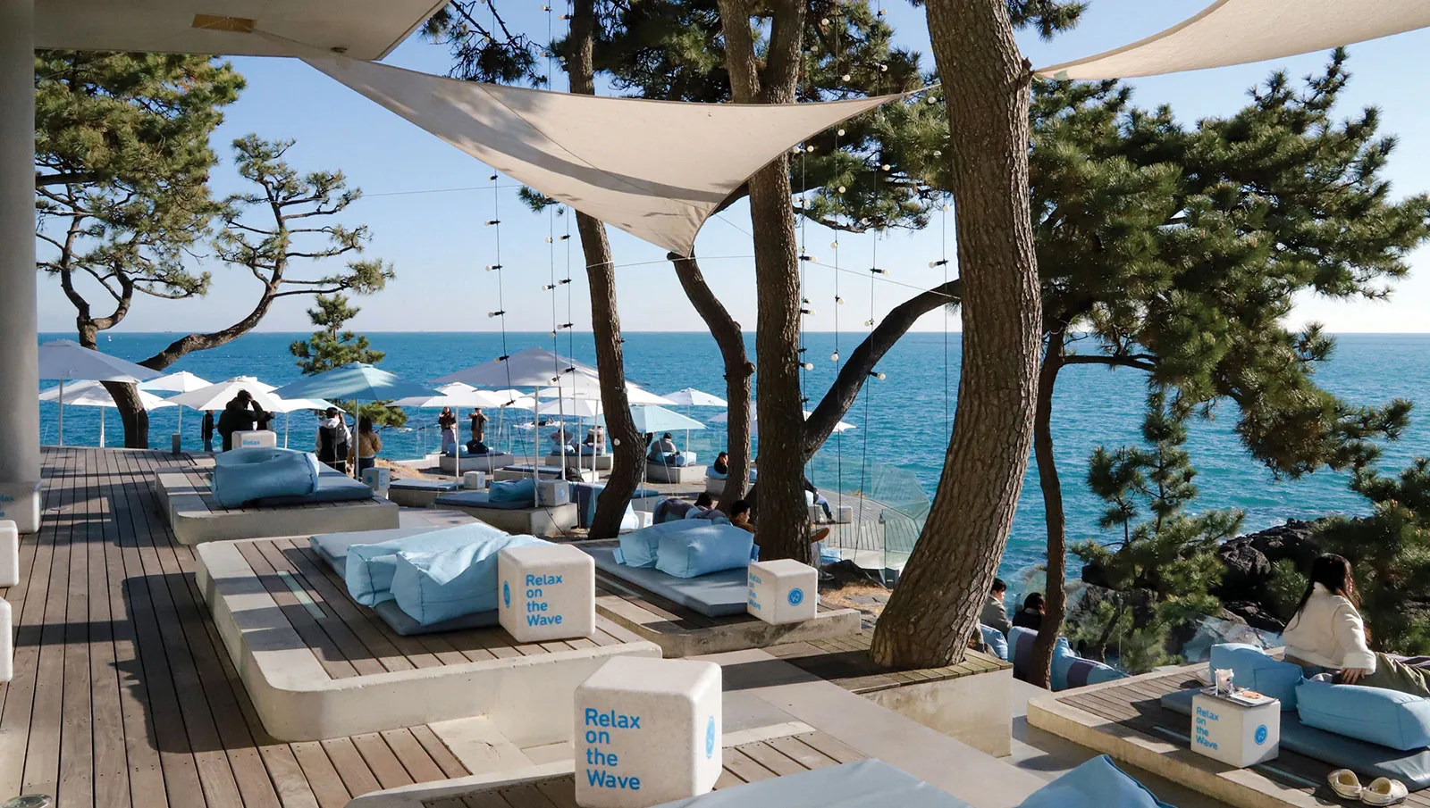 The space features high ceilings, wide open areas and large windows that open generously toward the sea. Inside the bar area, roasting machines are running, while baristas on one side focus intently on extraction. Customers can sit along the extended bar seating and watch the entire process: how their coffee is ground, how it meets water and how the aroma rises.