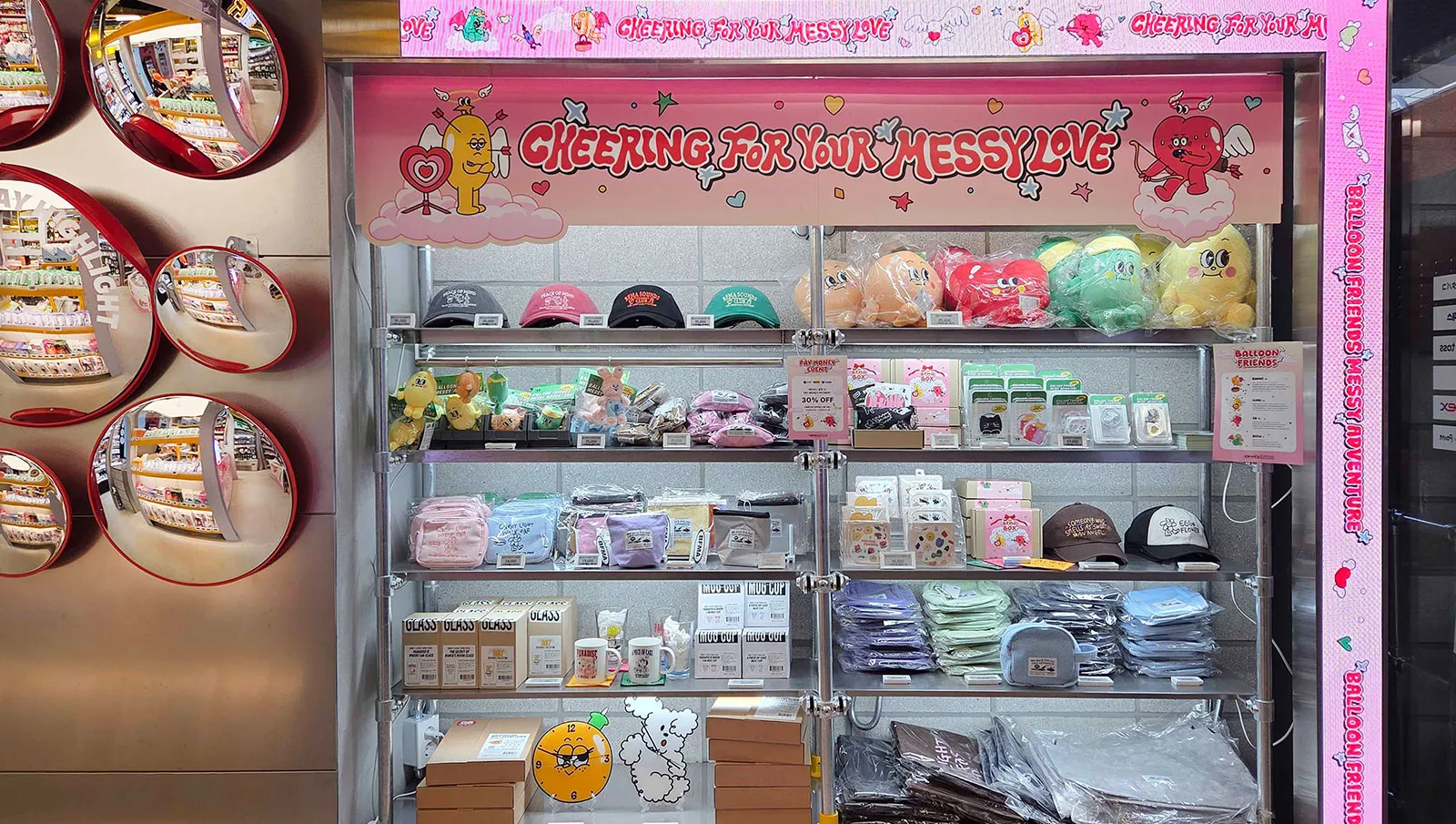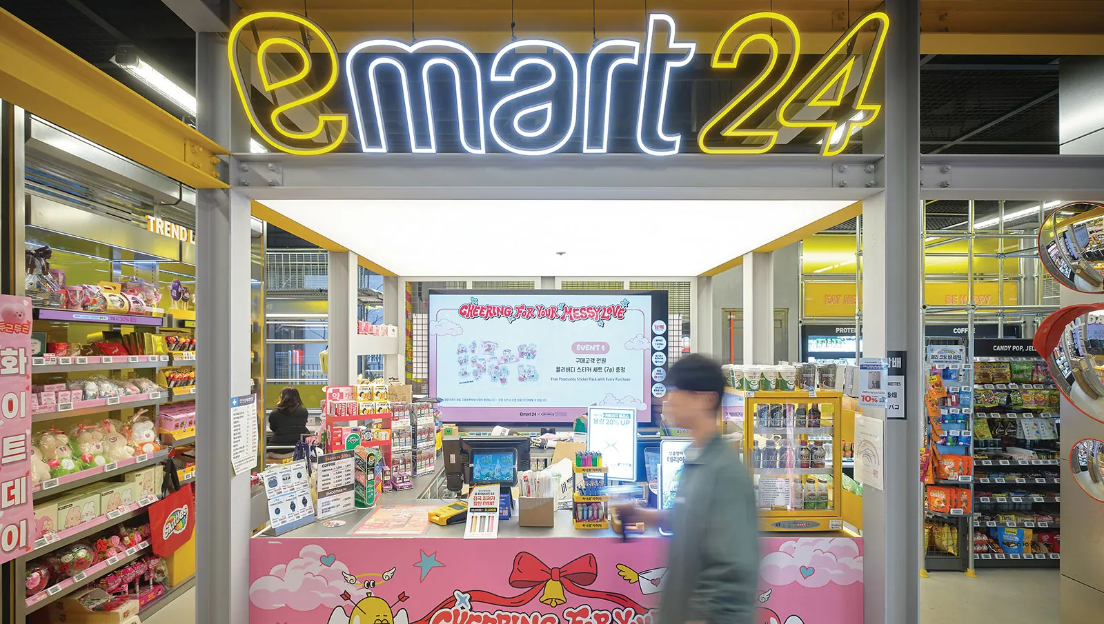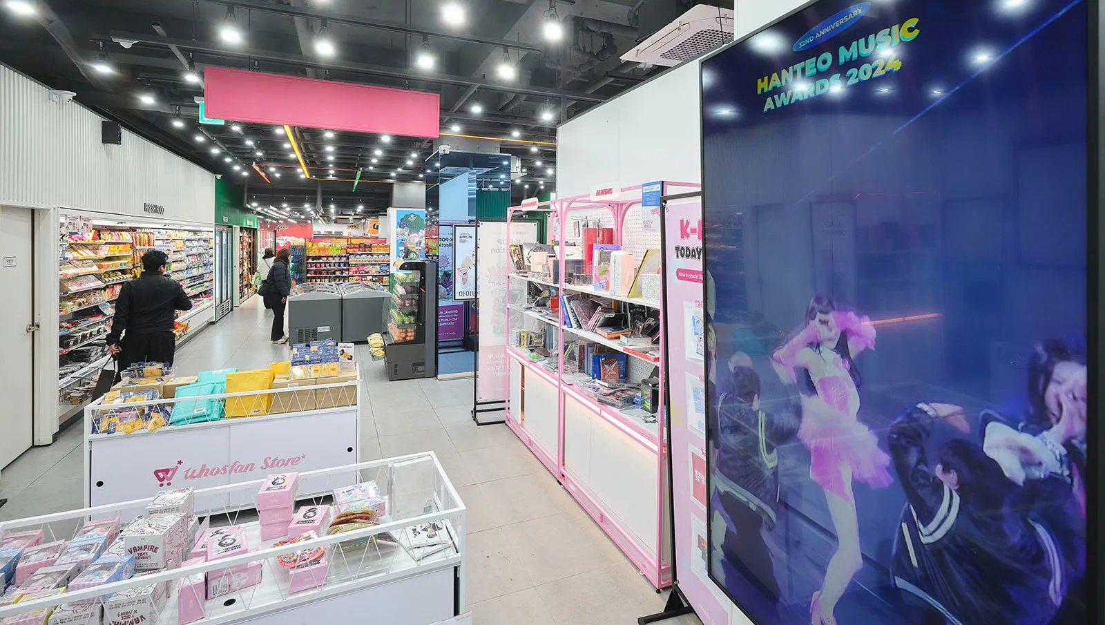 The product selection clearly has tourists in mind. Korean snacks, ramyeon (instant noodles) and drinks share space with K-pop merchandise, character goods and small diversions like random prize machines and photocard dispensers. Browsing the store feels like a little game in itself.