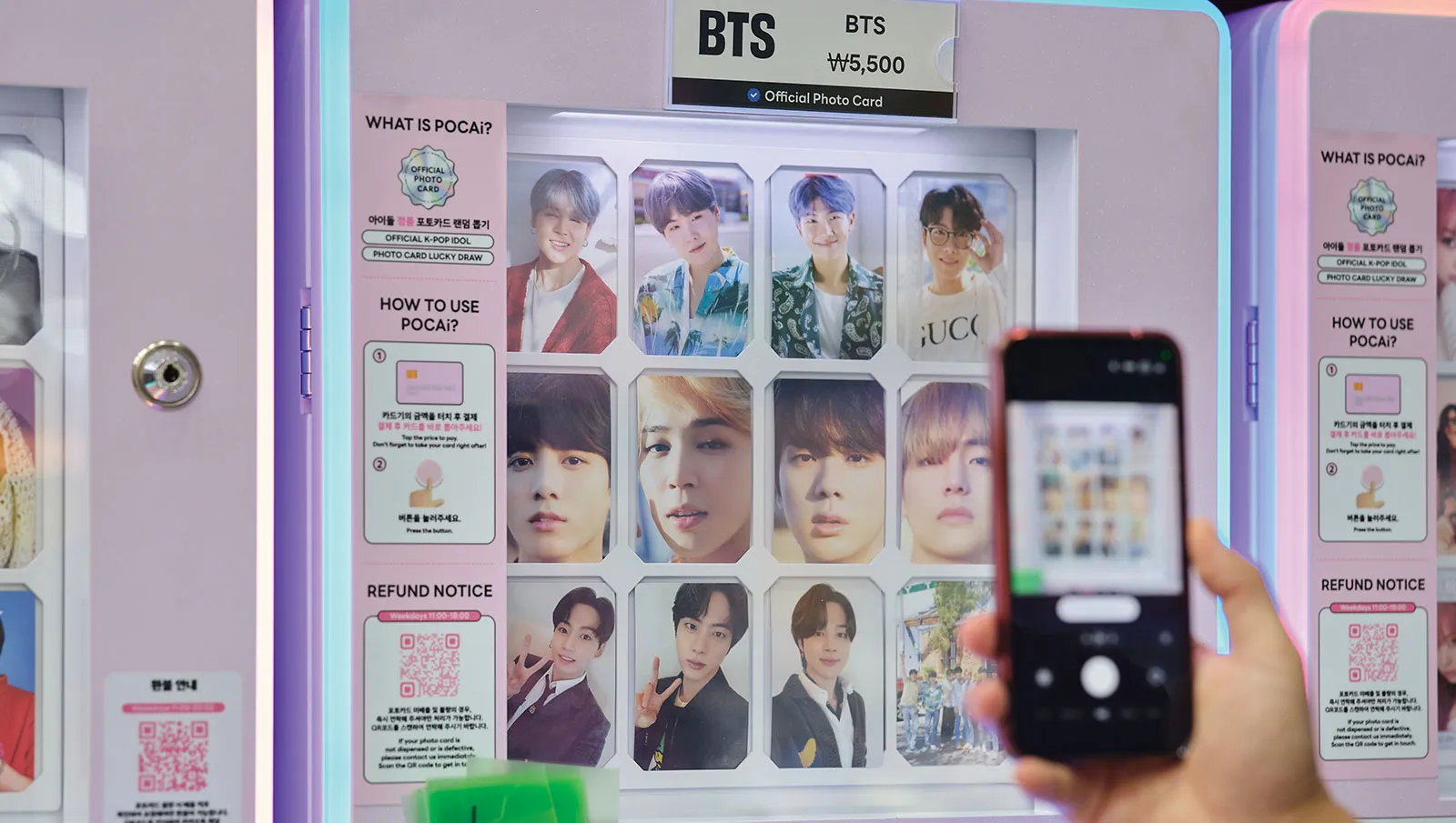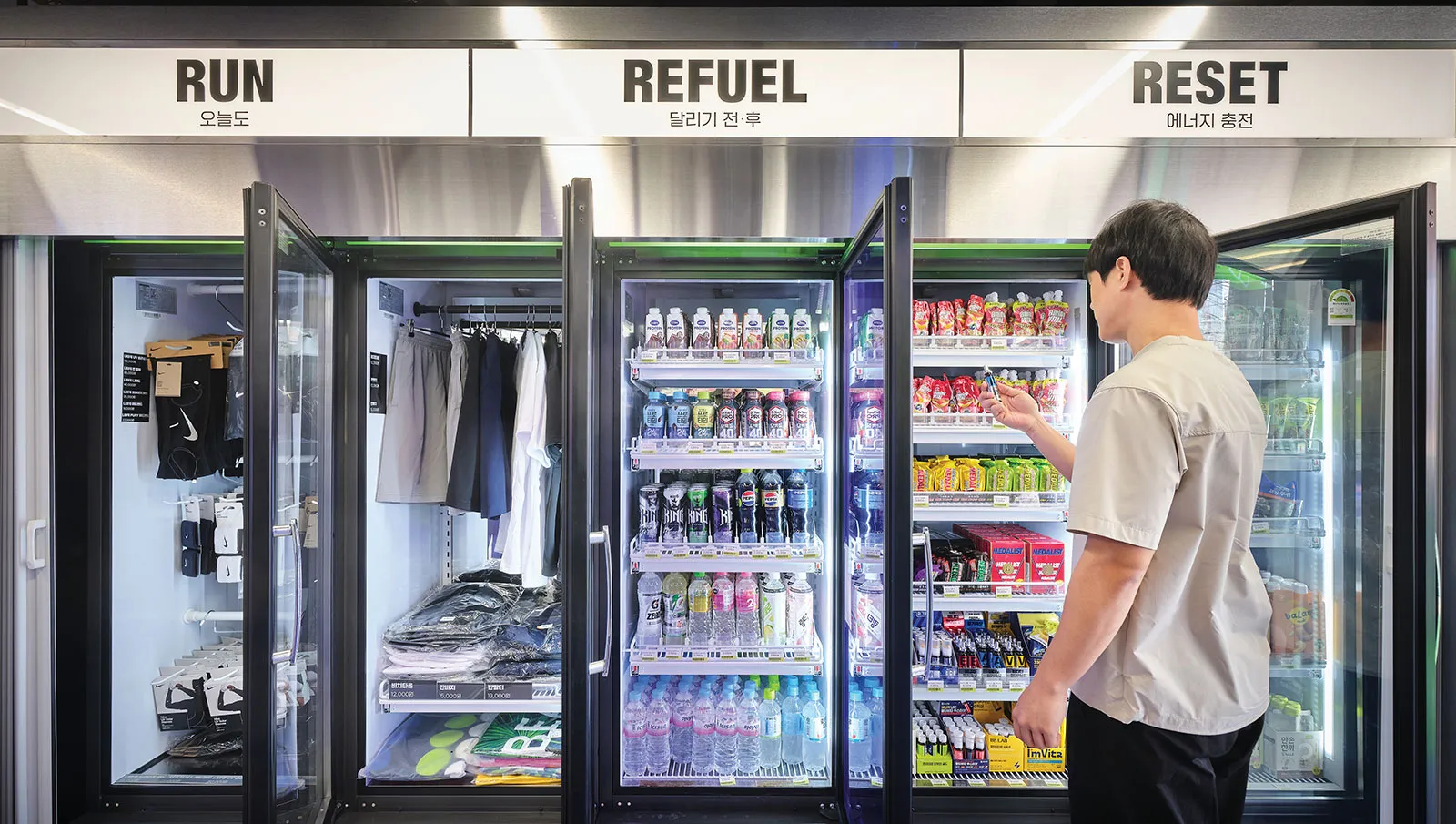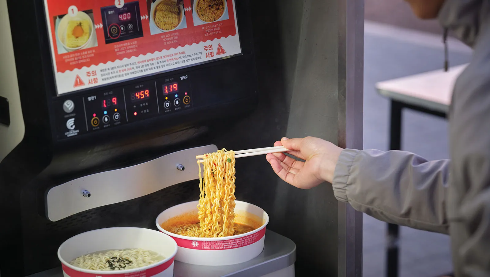 The product selection clearly has tourists in mind. Korean snacks, ramyeon (instant noodles) and drinks share space with K-pop merchandise, character goods and small diversions like random prize machines and photocard dispensers. Browsing the store feels like a little game in itself.