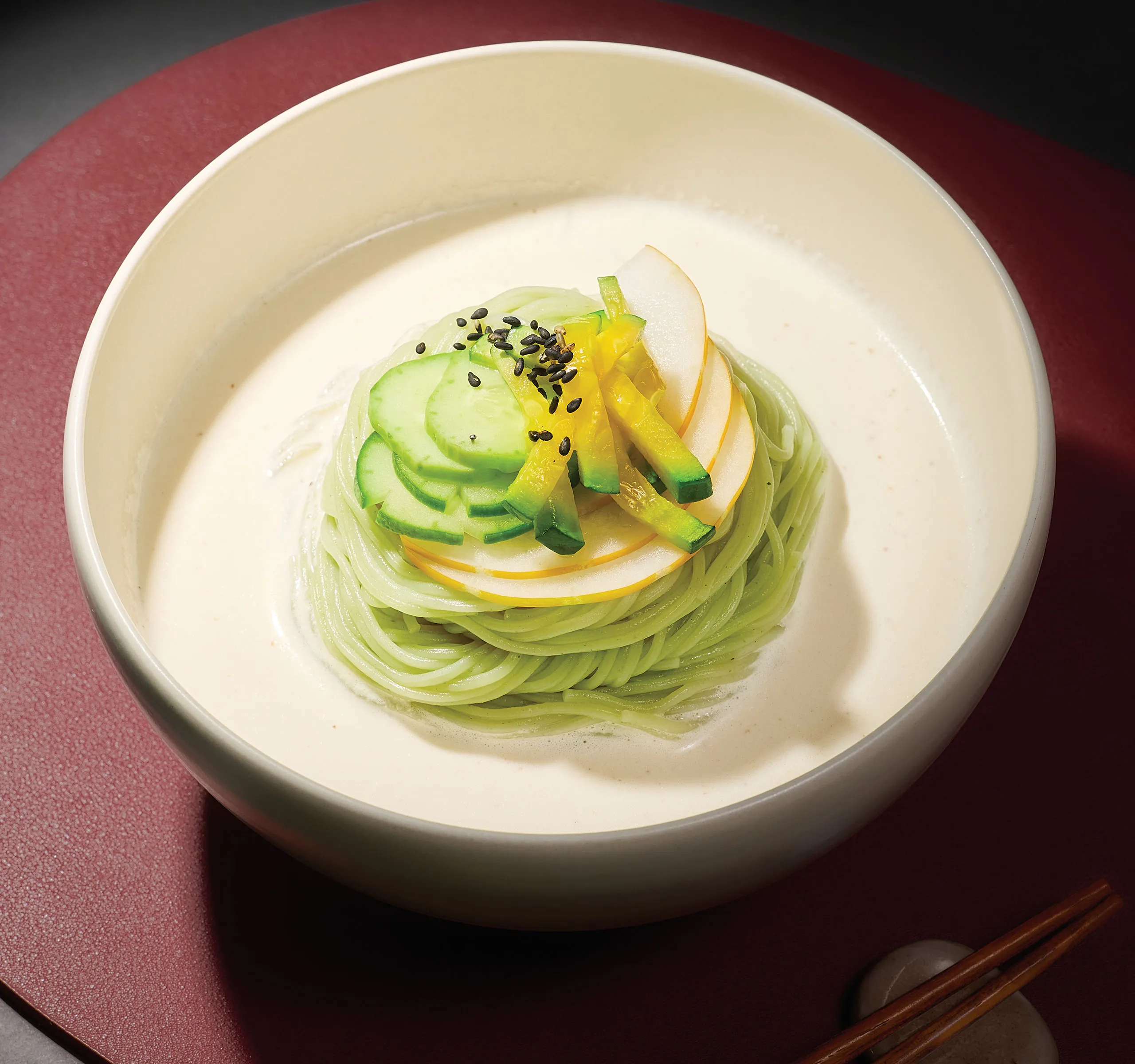 With that name raising expectations, a look at the preparation method is surprisingly simple. Pine nuts are toasted in a dry pan. To draw out their flavor as fully as possible, they are finely chopped, then blended with water and salt. That is the broth. The noodles are no more complicated: blanched zucchini and spinach are blended and strained, and the resulting liquid is gradually worked into flour to form a dough. Noodles are made with a pasta machine, boiled, the pine nut broth is poured over them, and cucumber, Korean melon and sesame seeds are added as garnish.