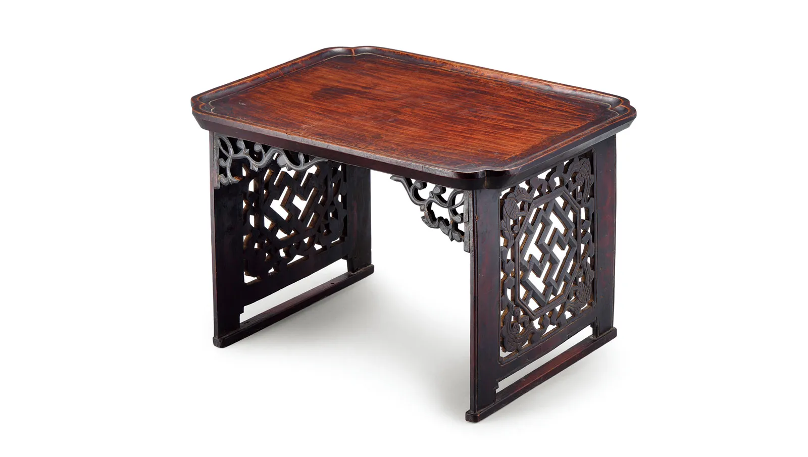 The chestnut tabletop has been lacquered for durability. Its surface, a deep reddish-black, is austere and spare. There is no decorative flourish—the beauty comes entirely from the form itself.