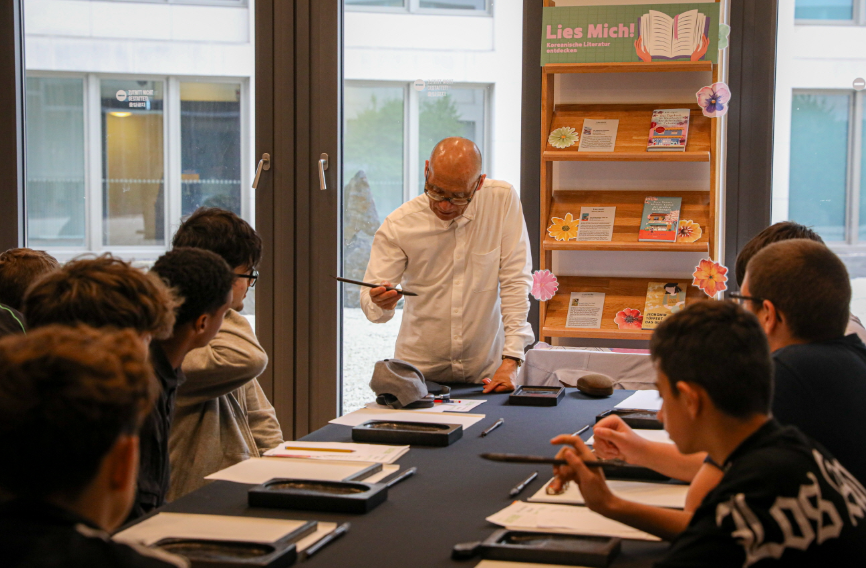 7월 17일(목), 하인리히 뵐 김나지움(Heinrich-Böll-Gymnasium)의 미술부가 주독일한국문화원(원장 양상근)에 방문하였습니다. 학생들은 한글의 시스템을 익히고 한글 서예를 배우며 한국 전통 붓글씨의 매력을 알아갔습니다. 이밖에도 한국 관련 퀴즈 및 케이팝 댄스를 즐기며 전통부터 현대에 이르기까지, 한국문화를 폭넓게 체험하는 시간을 가졌습니다.