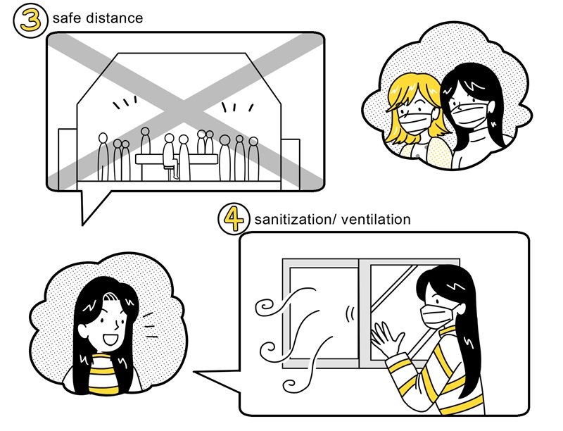 수현: 응, 세 번째는 2m 이상 ‘사람과 사람 사이 거리 두기’야. 예를 들어 기차나 고속버스의 좌석을 예매할 때는 한 좌석 씩 띄어서 예매를 해야해. 또 버스나 지하철을 이용할 때는 마스크를 착용하고 대화를 자제해야 해. 무엇보다 만나는 사람과 악수나 포옹 대신 목례나 팔꿈치 맞대기를 하는게 좋아.