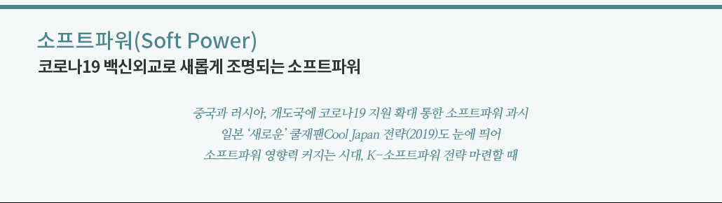 최근 세계 각국은 코로나19가 불러온 팬데믹 상황에 대응해 오면서 다시 한번 소프트파워에 주목한다. 팬데믹으로부터의 회복을 기회로 자국의 이미지와 영향력 확대를 도모하는 차원에서 자국의 소프트파워 전략을 점검하고 내실화하려는 자발적 움직임이 있는가 하면, 각국에 소프트파워를 발휘하도록 요구하는 국제적 압력도 있다.