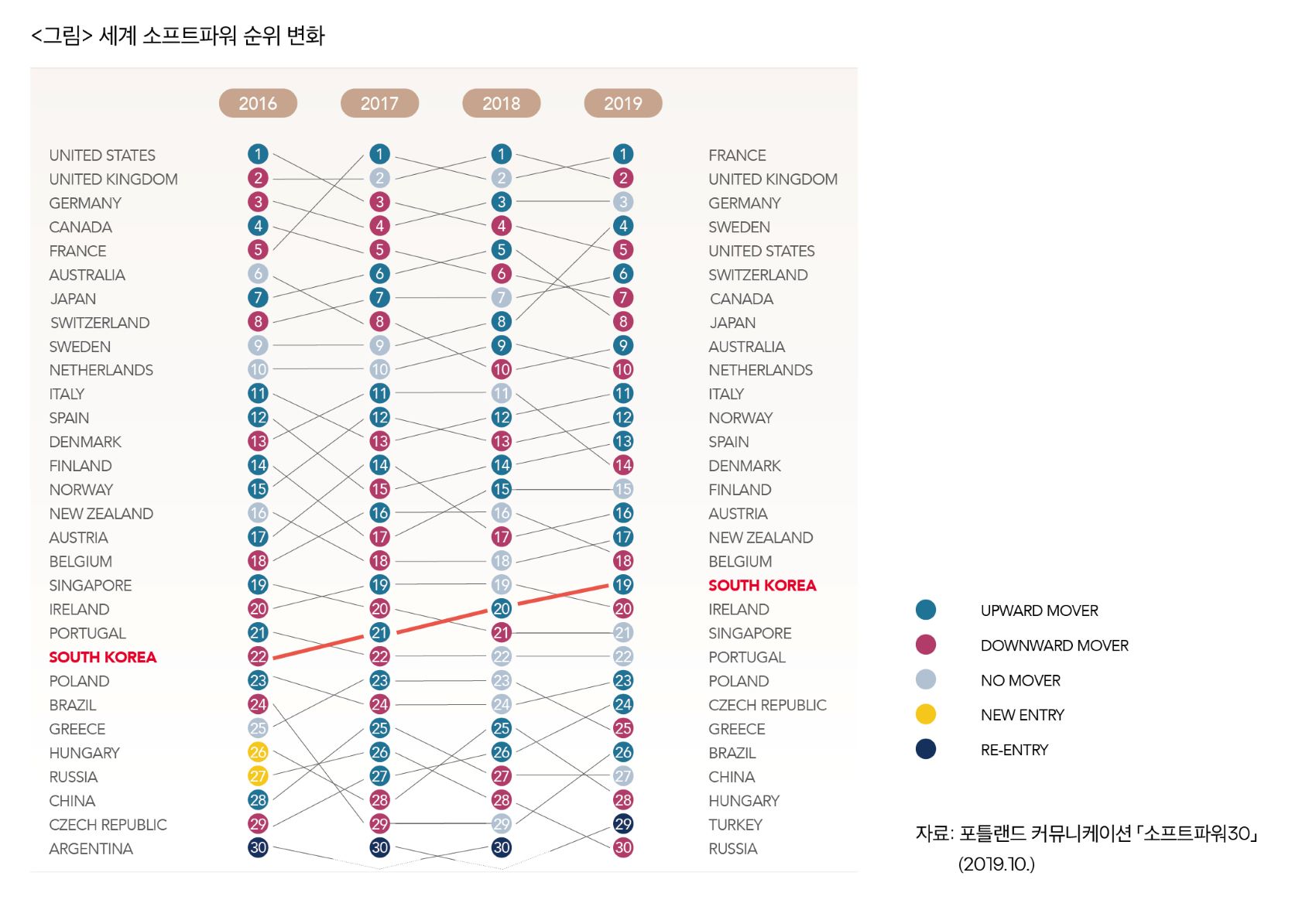 교육과 문화, 지식 등을 기반으로 한 영향력을 평가하는 ‘소프트파워’ 순위를 보면, 미국은 2016년 1위에서 트럼프 정부가 출범한 2017년에는 3위, 2018년 4위, 2019년 5위 등으로 하락 추세를 멈추지 않고 있다. 트럼프 前대통령의 제로섬 세계관과 무역 전쟁 등이 미국의 소프트파워를 하락시키는 요인으로 평가됐다. 1위는 프랑스로 국제기구 활동을 활발히 한데다 G7 회의를 성공적으로 개최한 점이 높게 평가됐다. 한국은 30개국 중 19위로 2016년 22위에서 꾸준히 상승하고 있다(<그림> 참조).