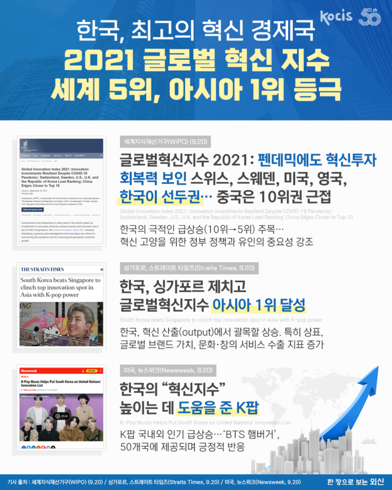 2012 글로벌 혁신지수에서 한국이 세계 5위, 아시아1위로 등극. 한국은 작년 10위에서 5위로 괄목할 상승. 특히 상표, 글로벌 브랜드가치, 문화와 창의 서비스 수출지표가 크게 상승했는데, 여기에는 K팝 글로벌 인기가 크게 기여한 것으로 분석됩니다